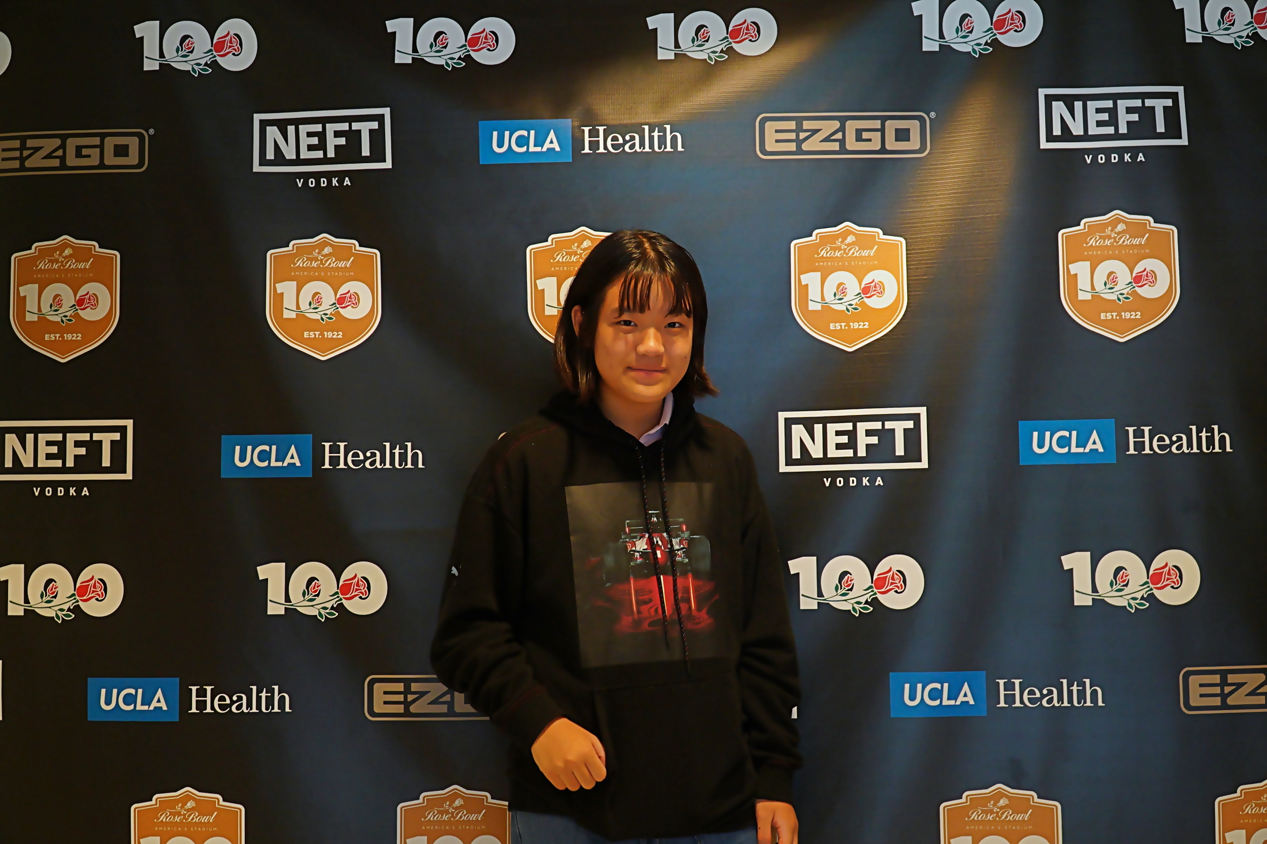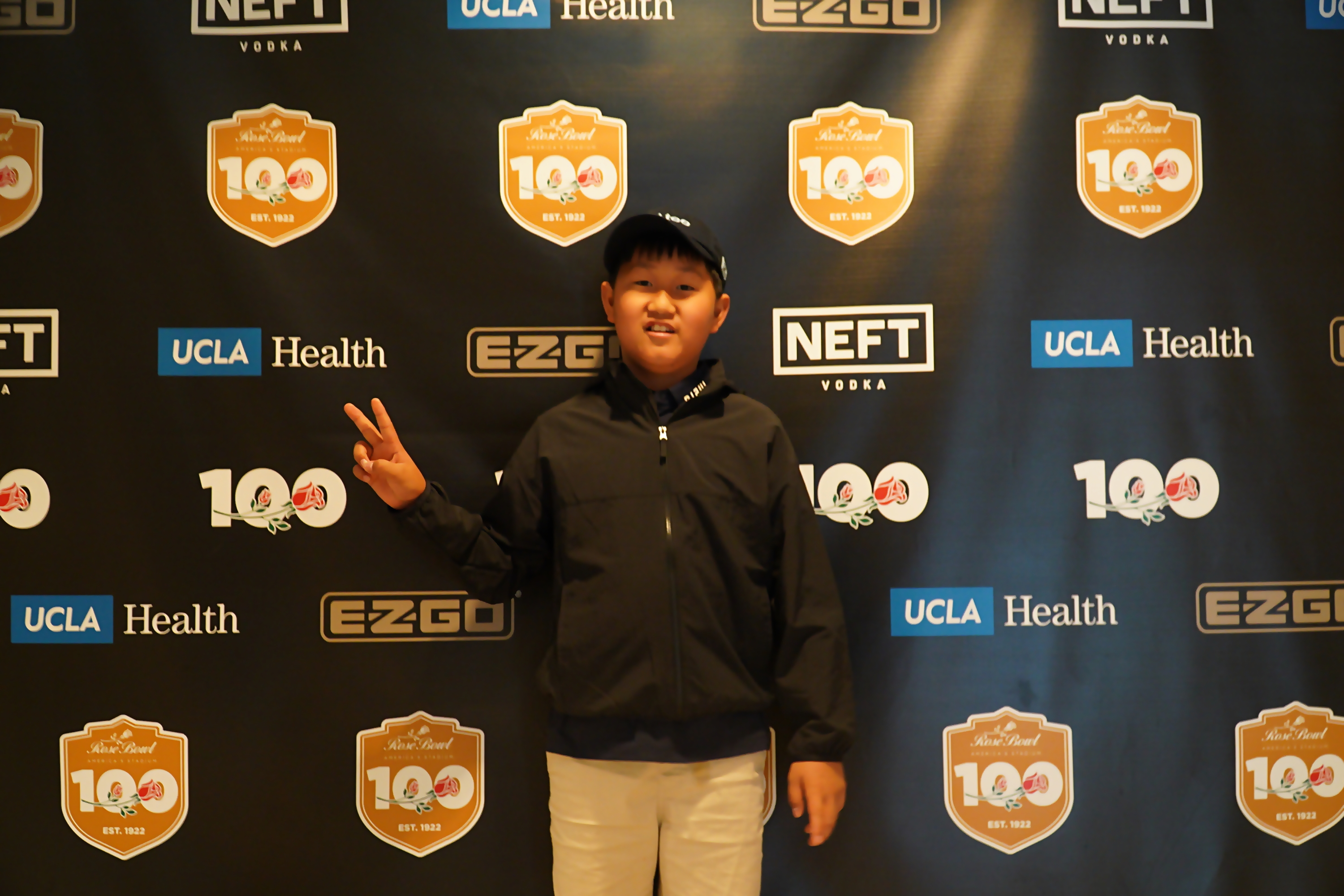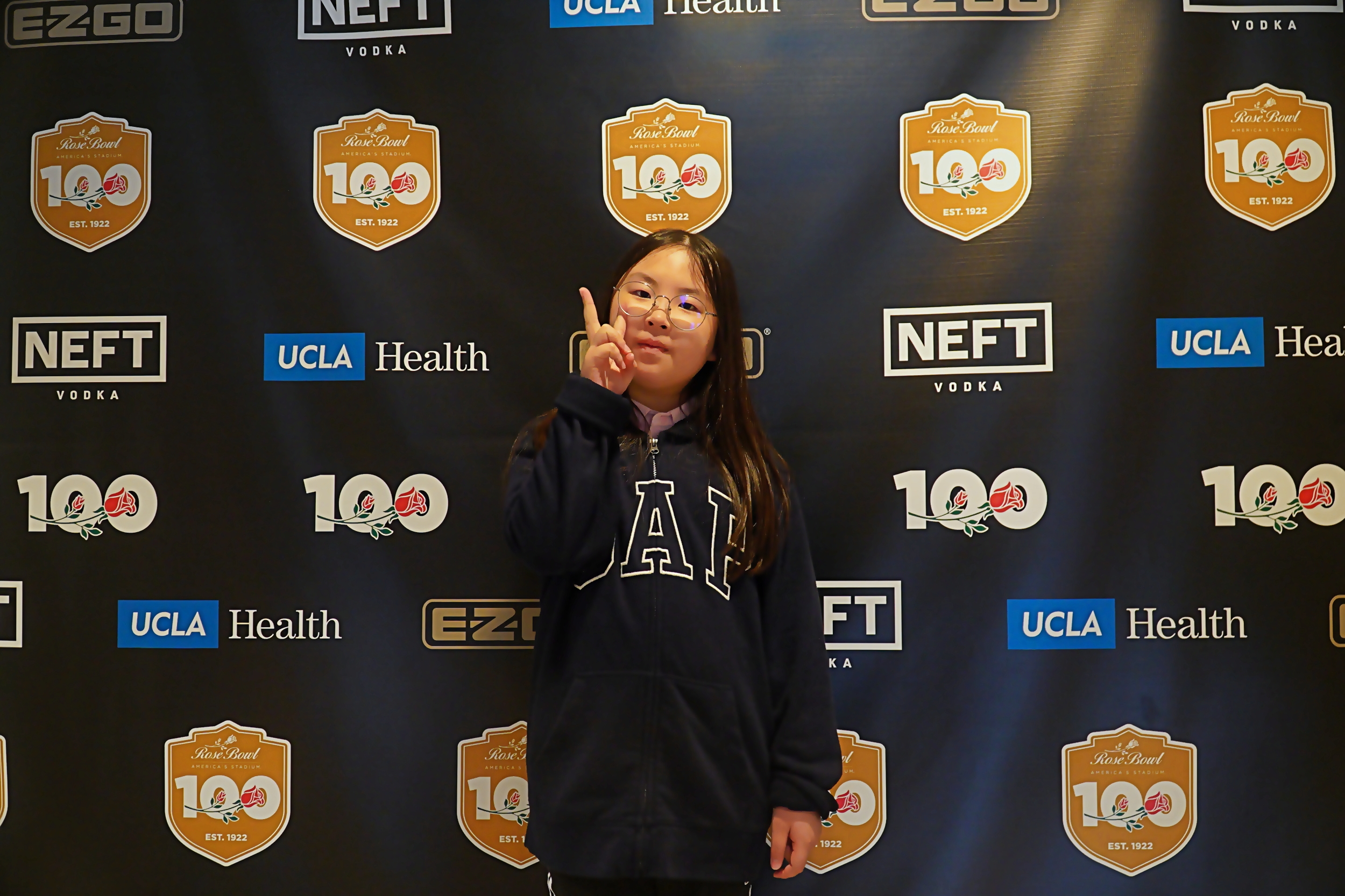 100주년 기념 백드롭 앞에서 기념 사진을 찍고 있는 아이들