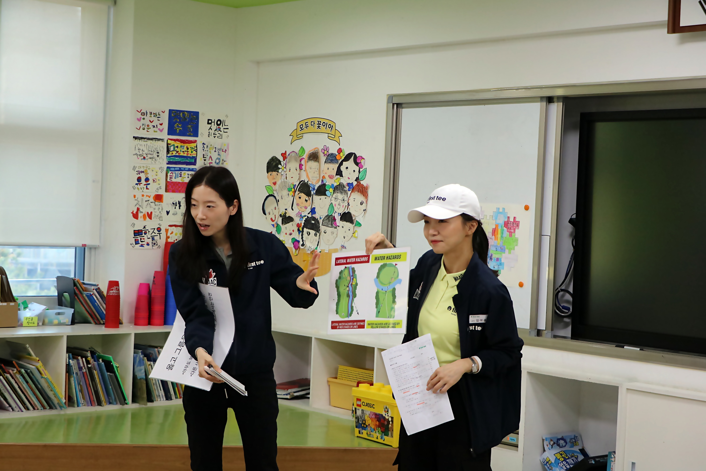 워터헤저드의 종류와 이곳에 볼이 들어갔을 때 그 처리방법을 설명해 주고 있는 모습