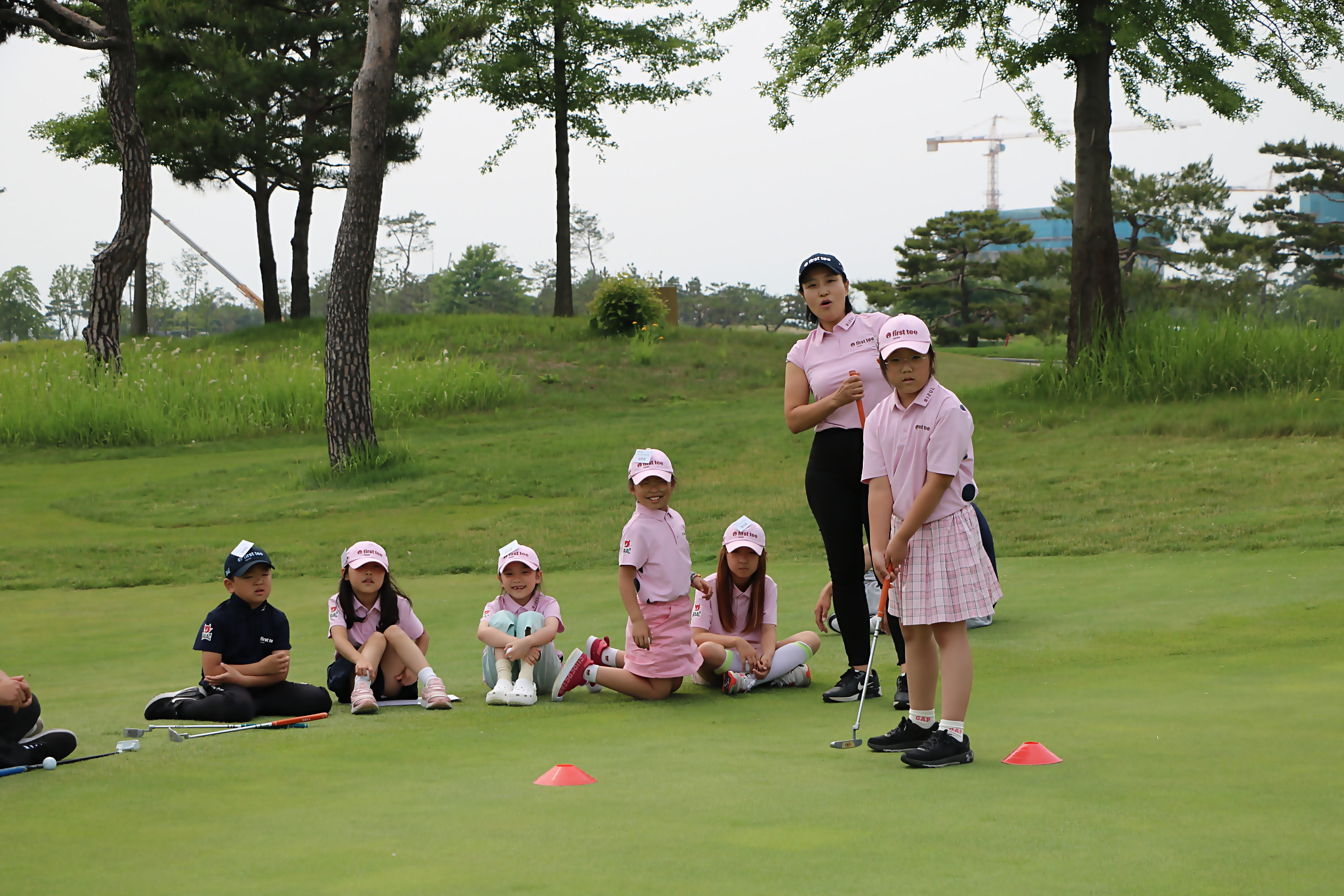 상대팀이 퍼팅하자 코치님과 함께 공이 굴러가는 방향에 시선을 집중하고 있는 모습