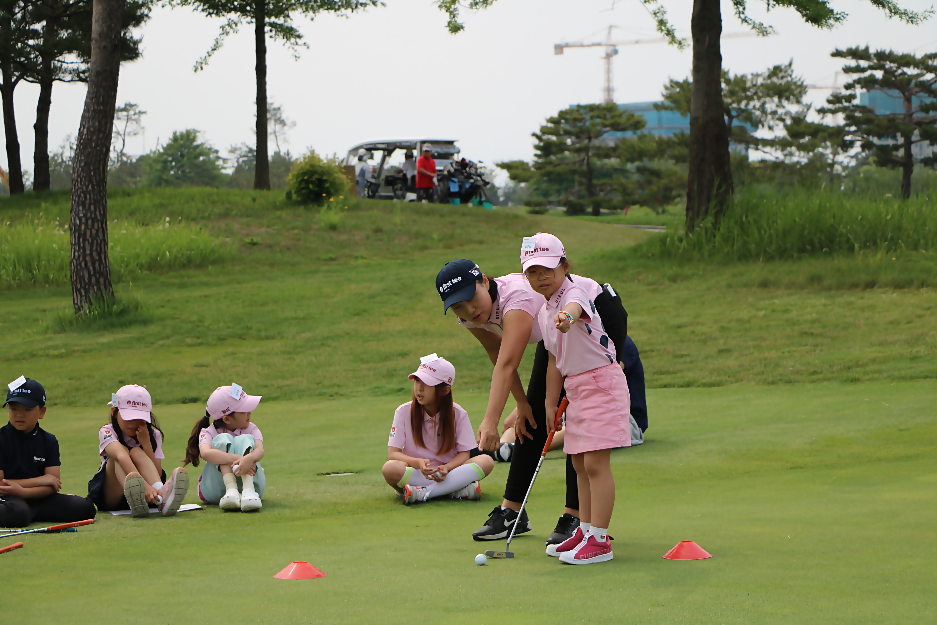 코치님께 내리막 라이에 대처해서 공략하는 방법에 대해 질문하고 있는 모습