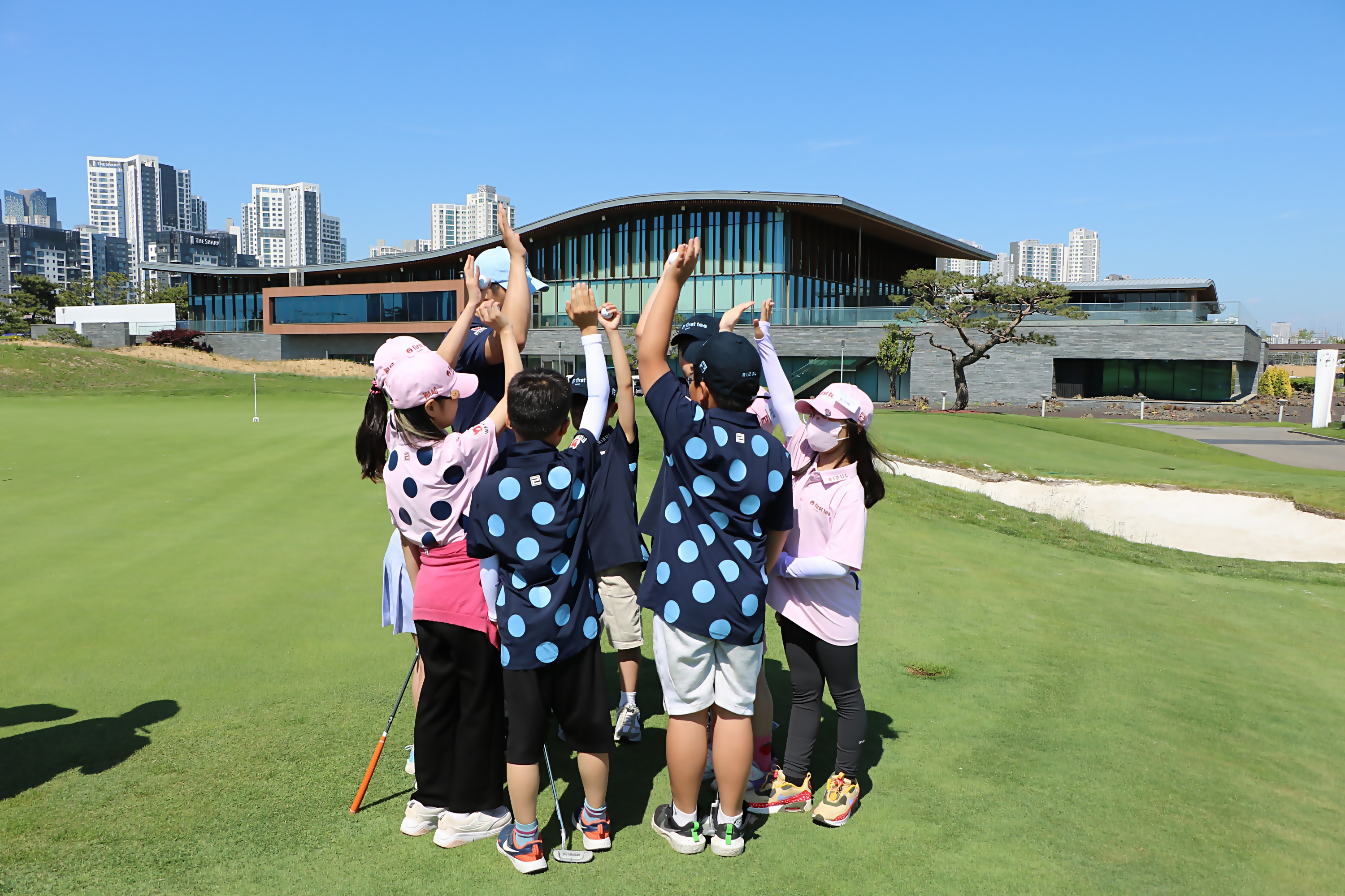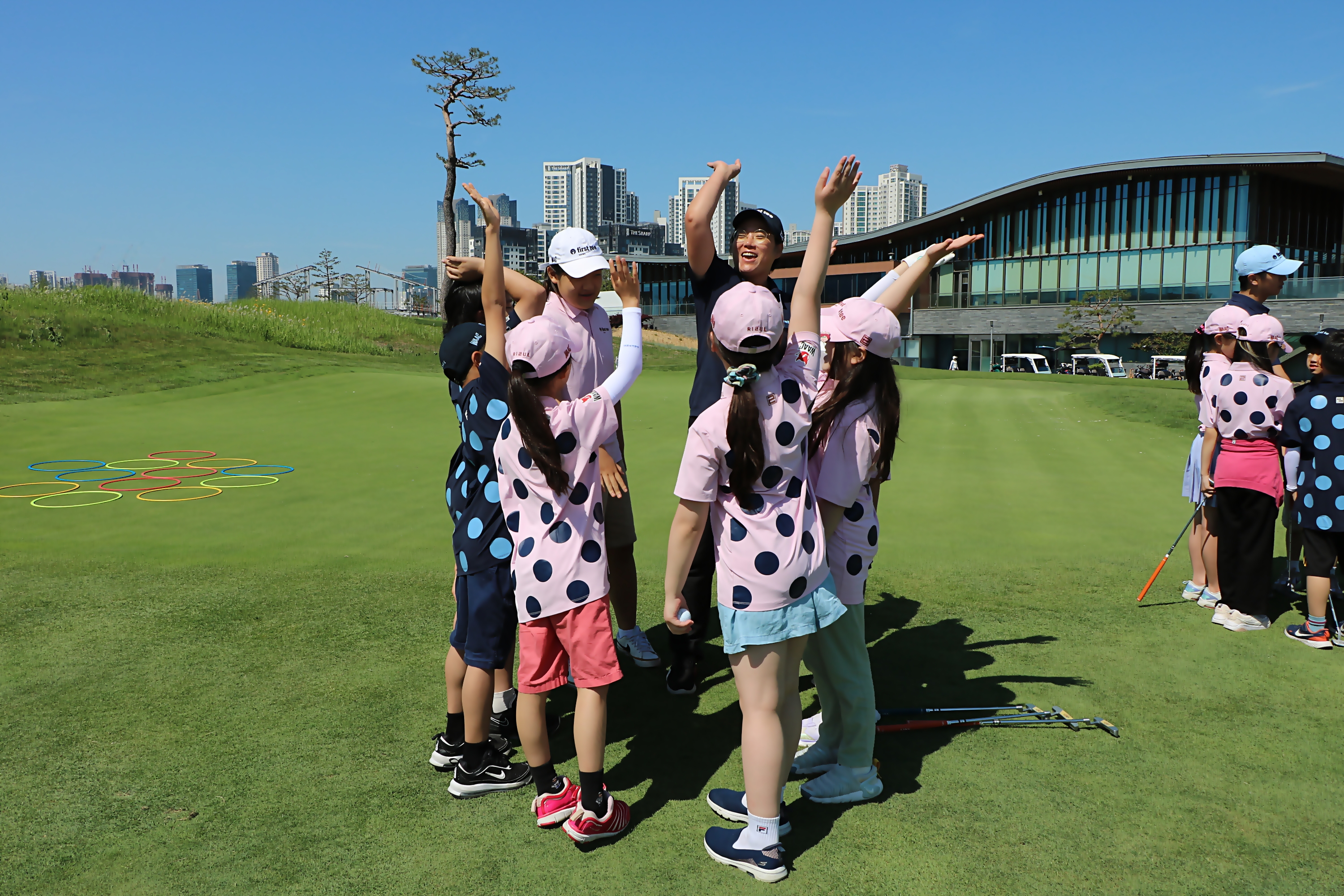 퍼팅 팀 대항전을 앞두고 화이팅을 외치며 전의를 다지고 있는 모습