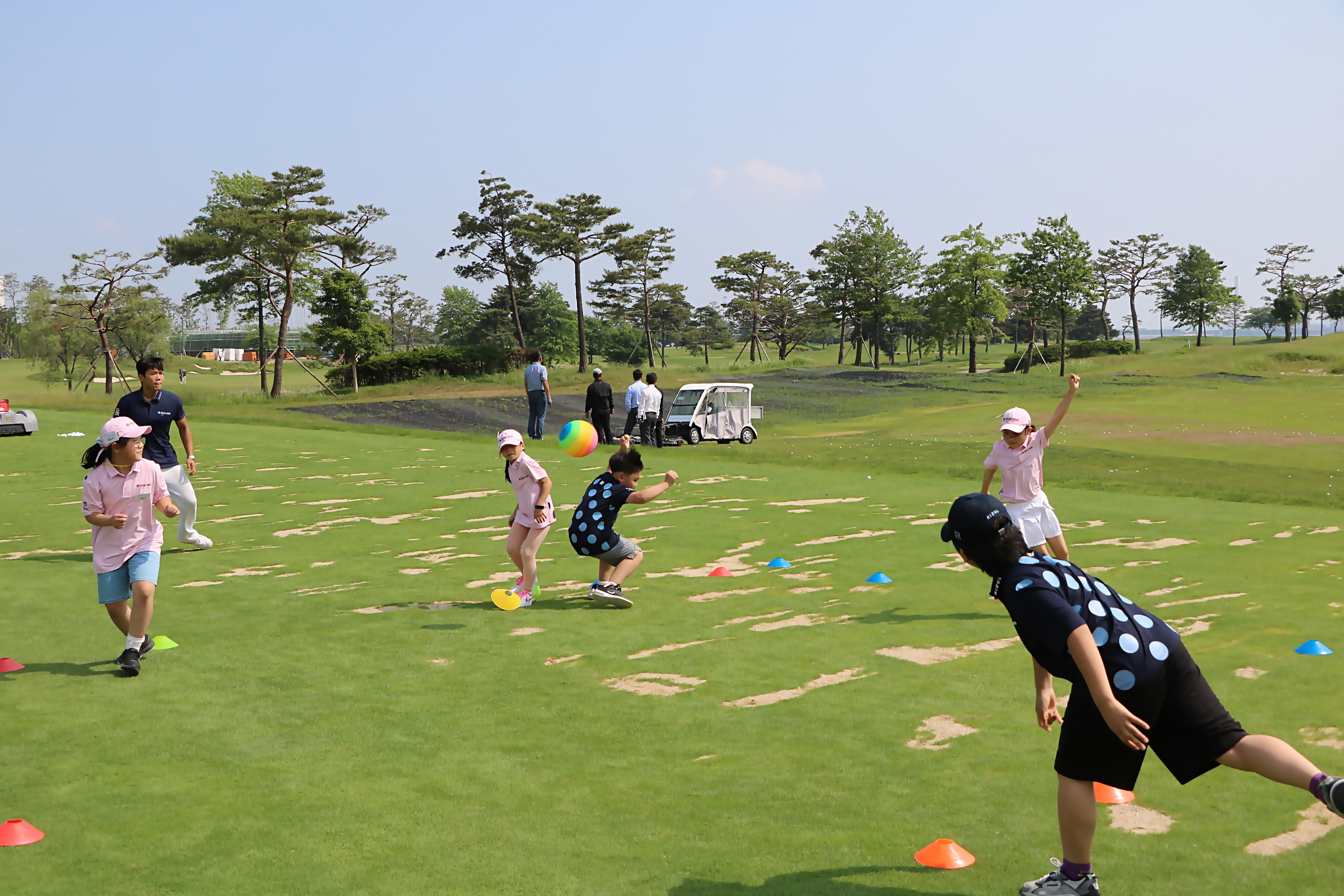안전구로 피구를 하면서 가볍게 몸을 풀며 팀 단합의 중요성에 대해 배우고 있는 아이들