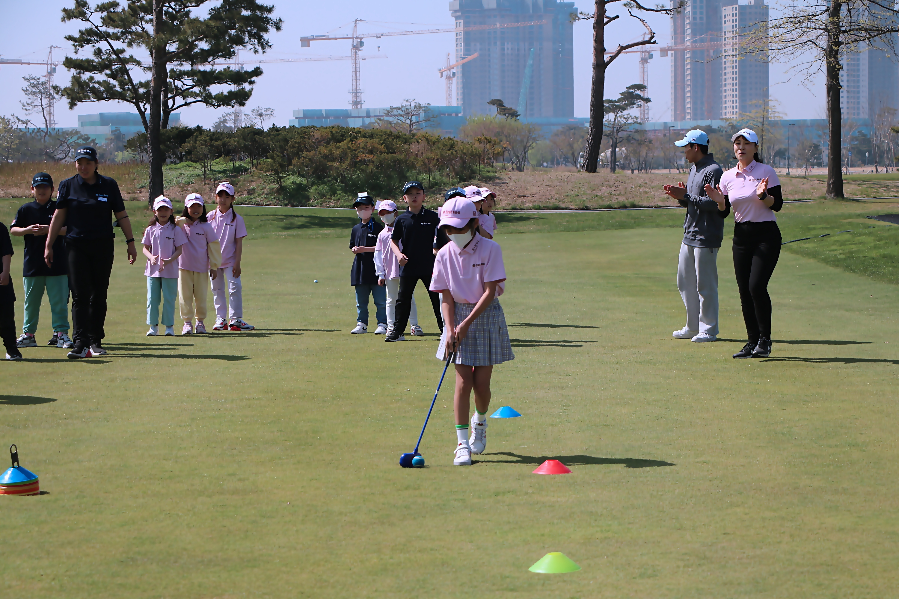 골프클럽과 좀 더 친숙해 질 수 있도록 게임을 통해 훈련하고 있는 모습