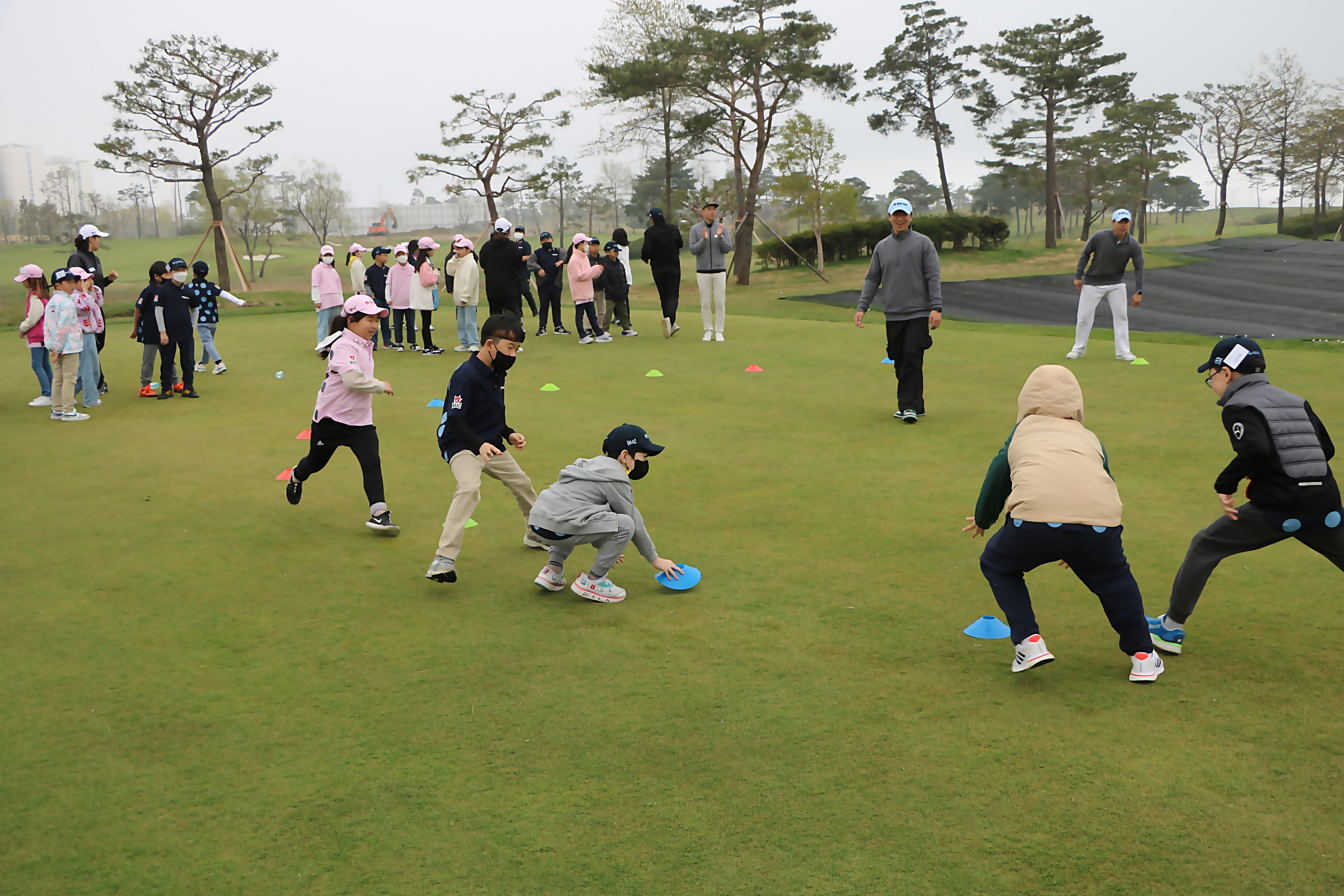 원을 돌면서 코치님의 구령에 맞춰 호명된 콘을 집는 게임을 하며 즐거워 하는 아이들