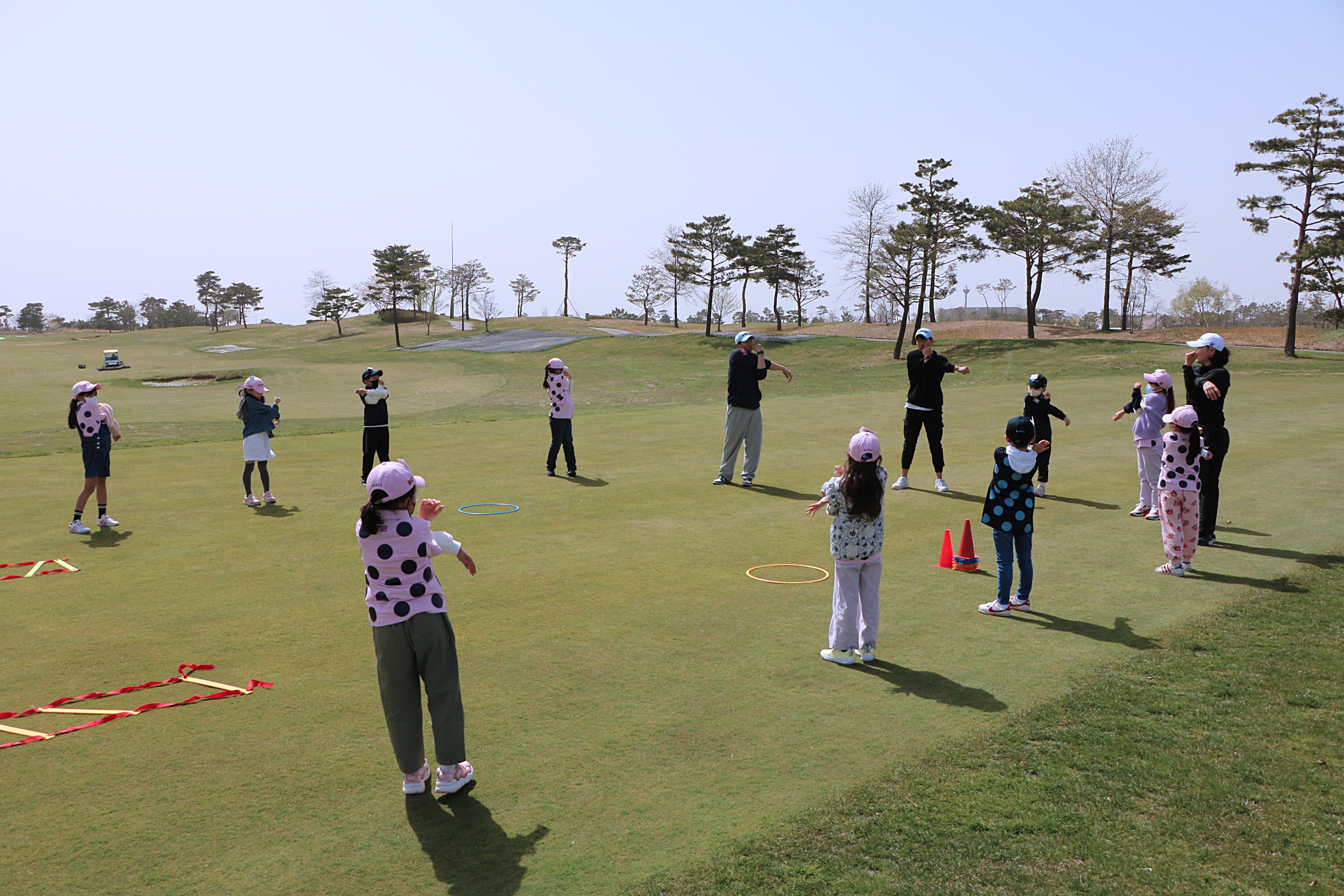 코치님을 따라 코끼리 코를 하고 스트레칭을 하고 있는 아이들