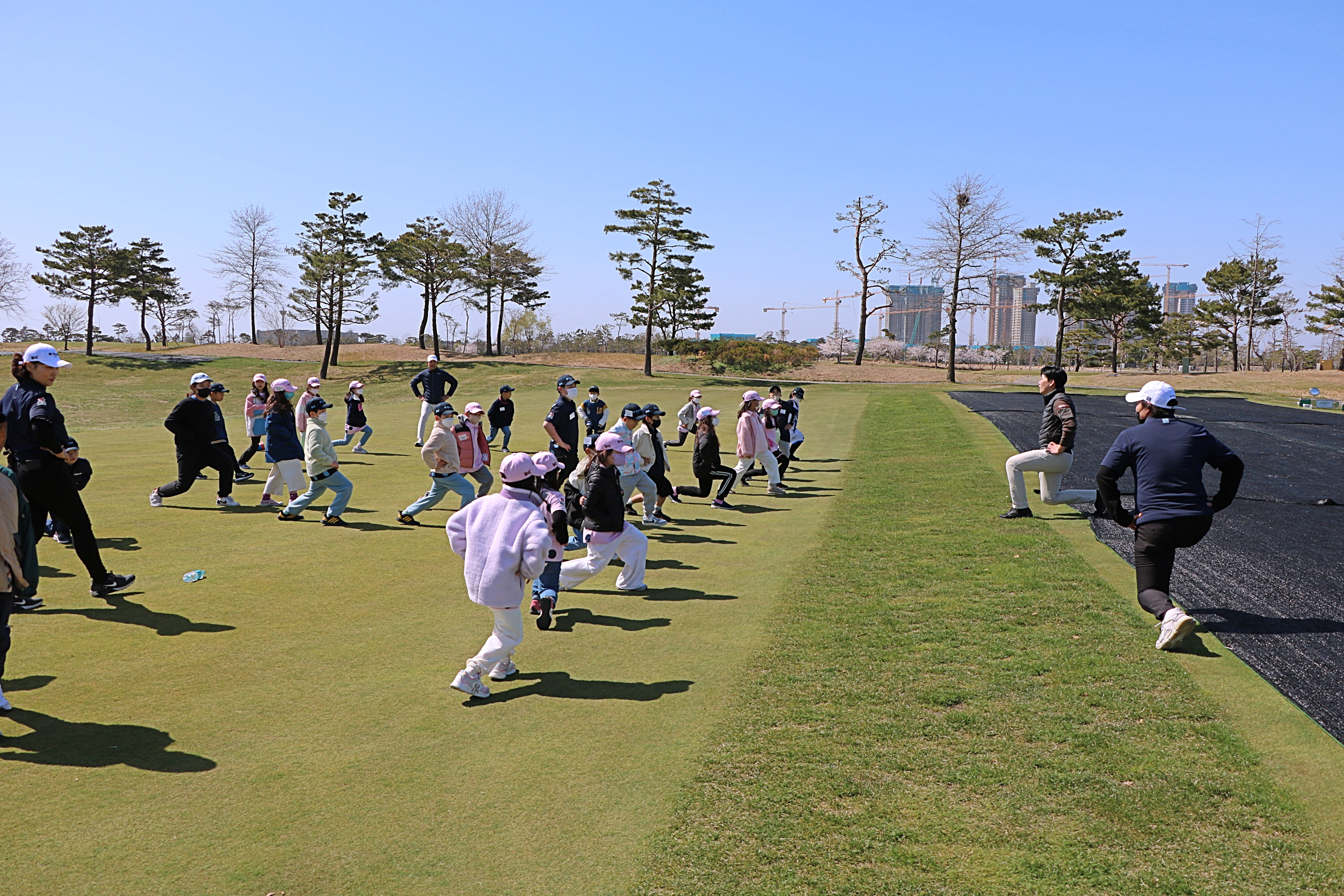 코치님과 함께 런지동작을 따라 하며 몸을 풀고 있는 아이들