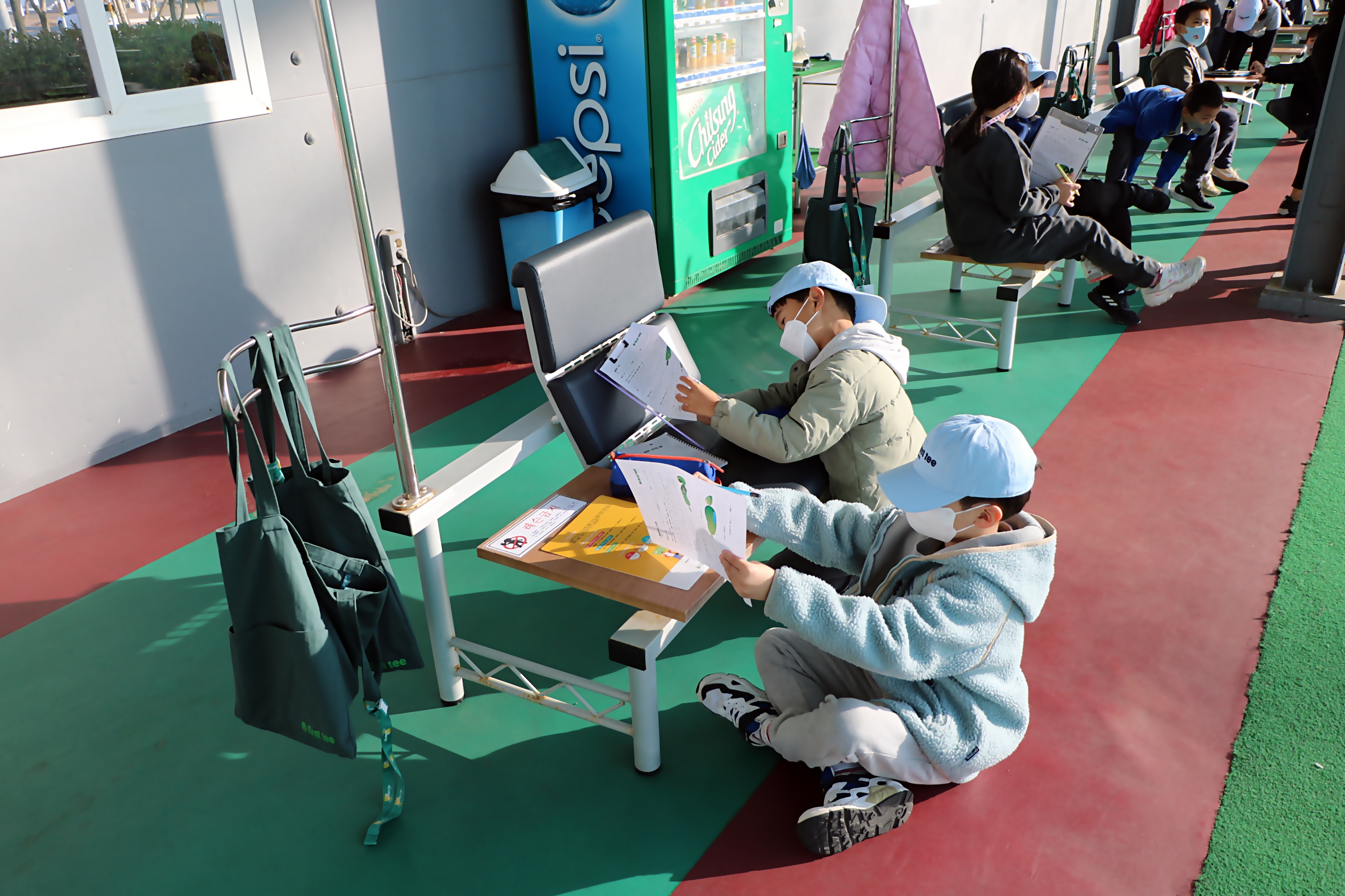 종합평가 후 서로 문제지를 바꾸어 채점을 해주고 있는 모습