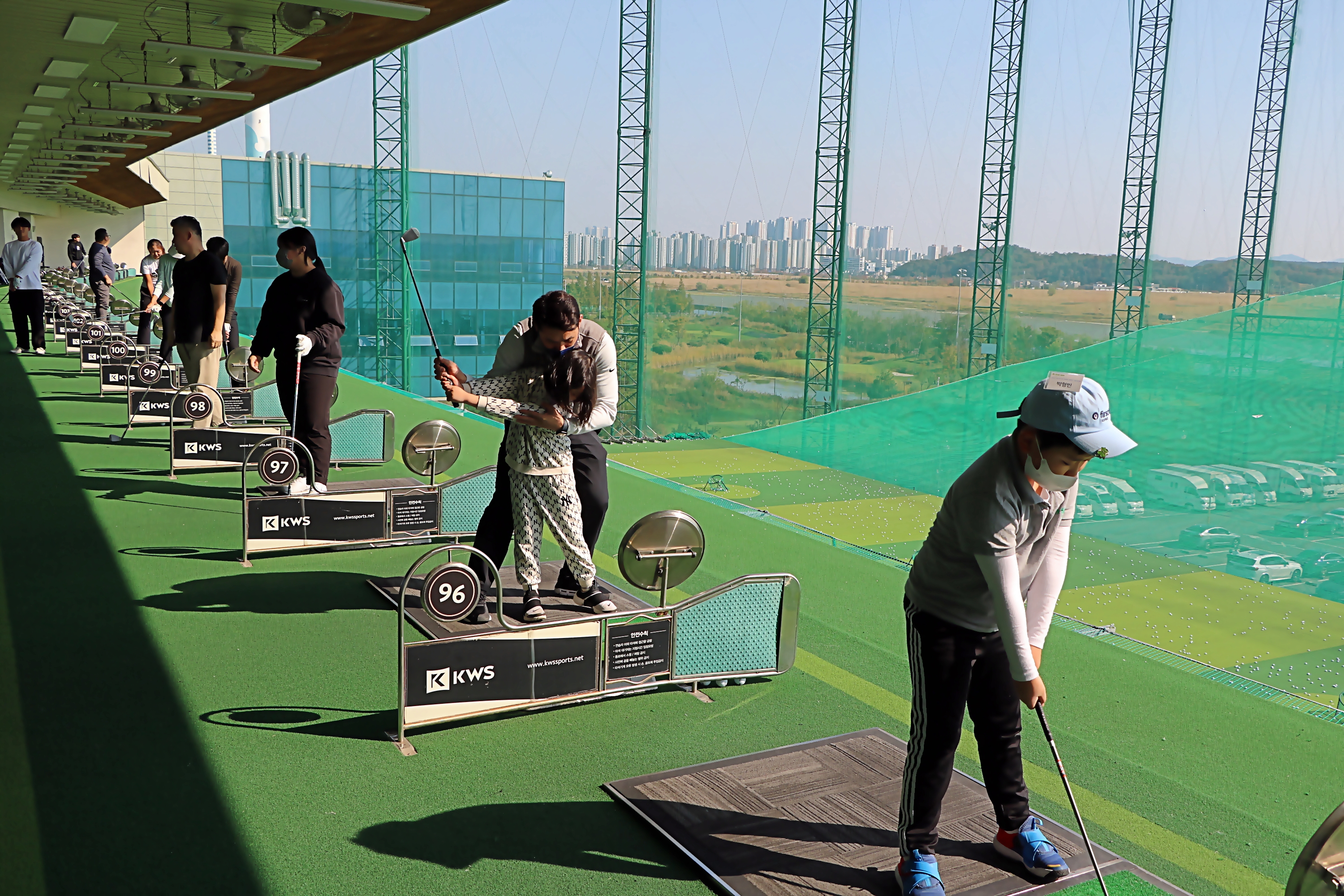 질서정연하게 순서대로 돌아가며 골프스윙 연습을 하고 있는 아이들