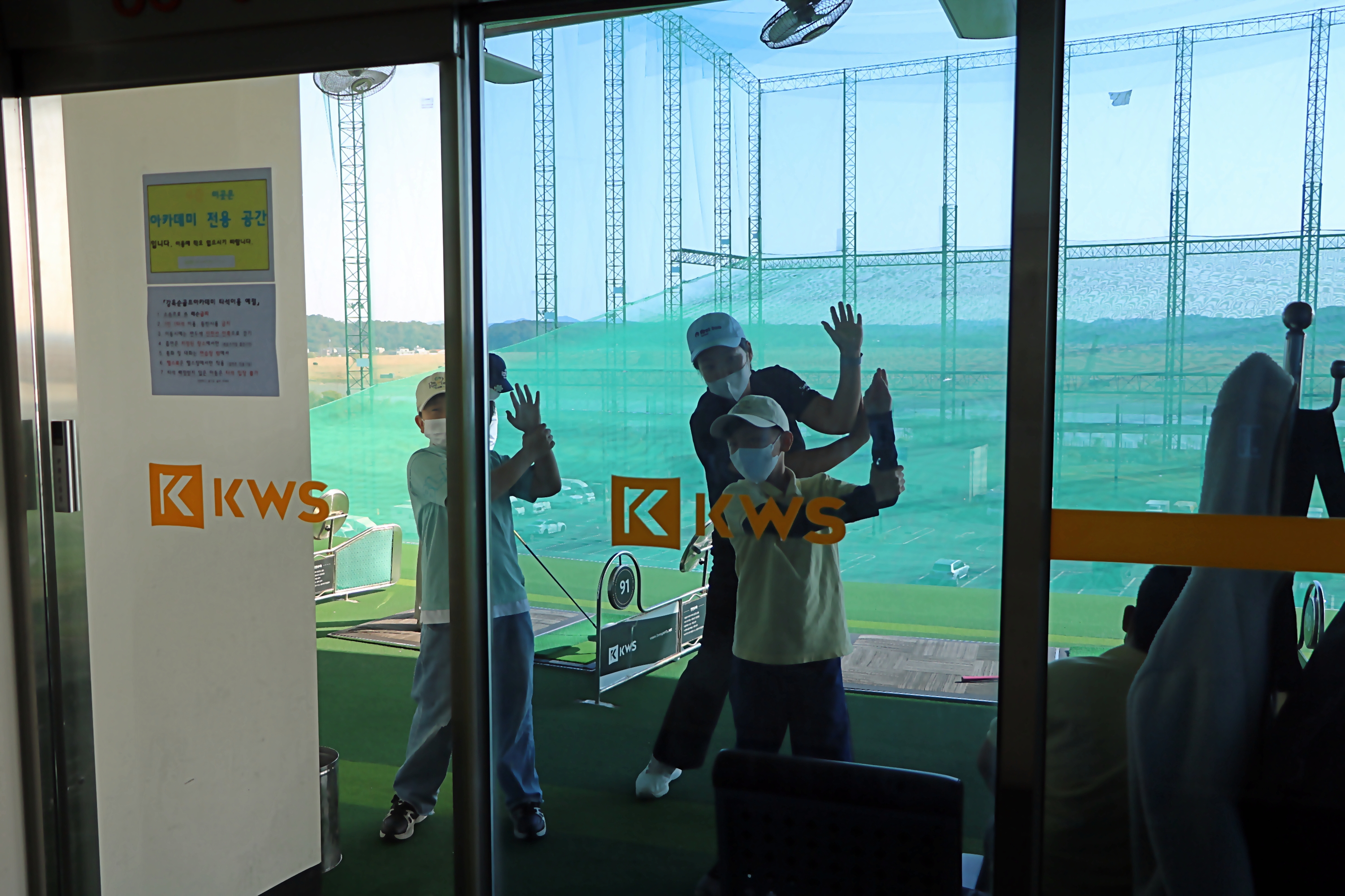 유리에 비친 자신의 모습을 보면서 코치님을 따라 스윙 연습을 하고 있는 모습