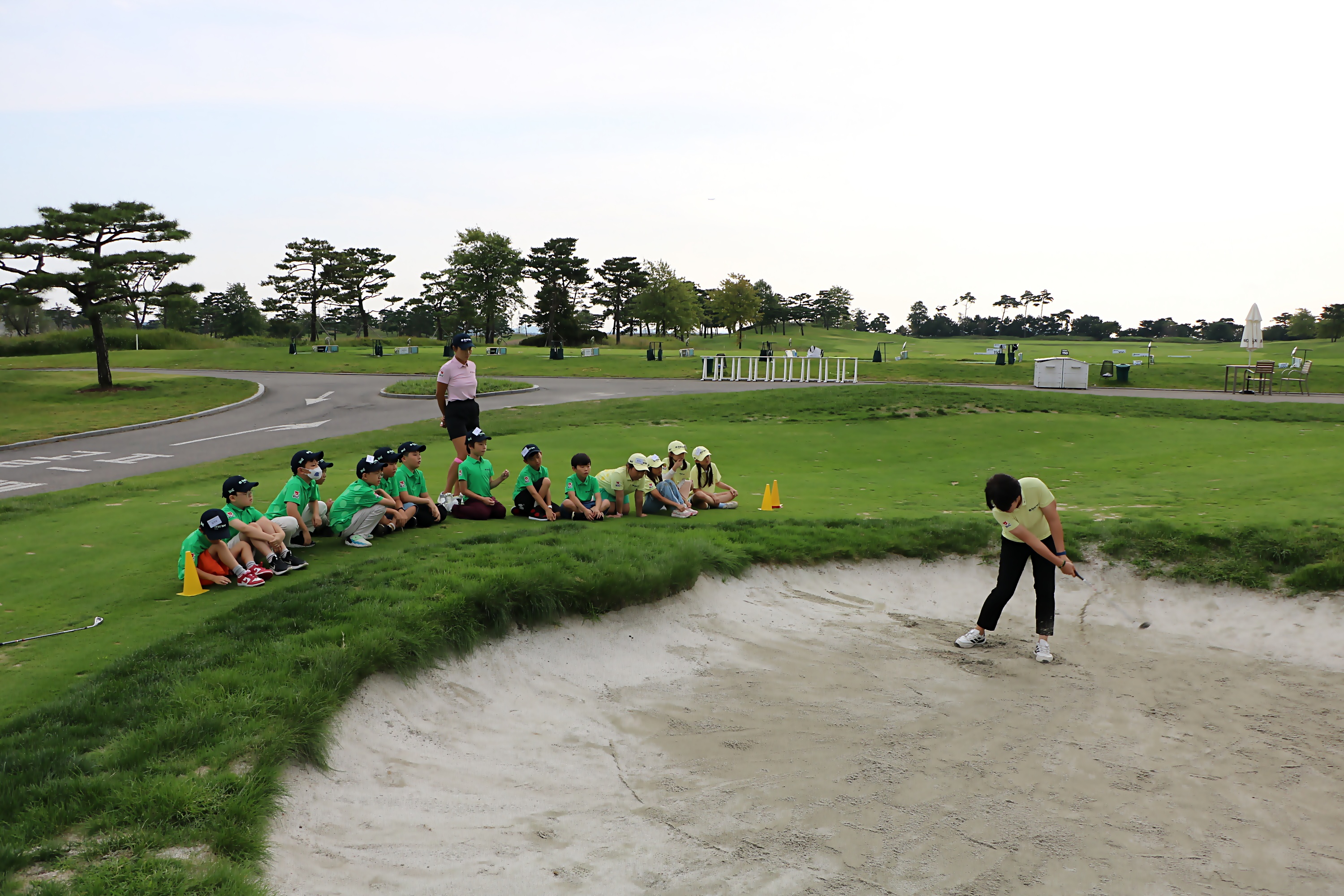 벙커샷 하는 요령에 대해 전체 강의를 하고 있는 모습