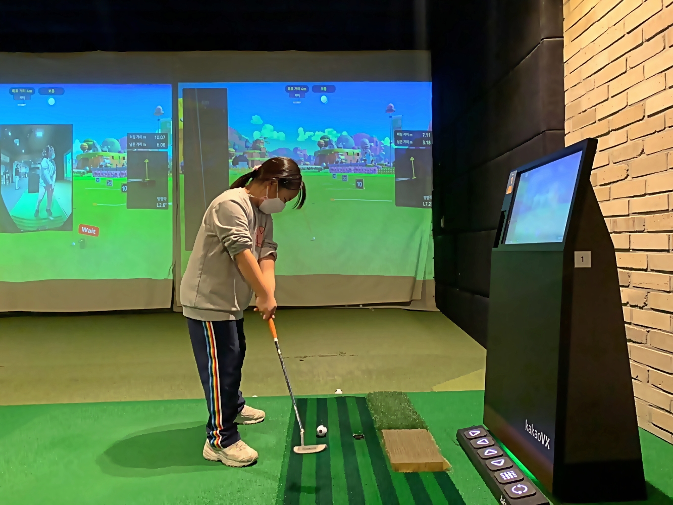 기존 교육장인 실외연습장인 송도스포츠파크와 다른 스크린골프에서 퍼팅 등 다양한 골프실습을 해보고 있는 모습