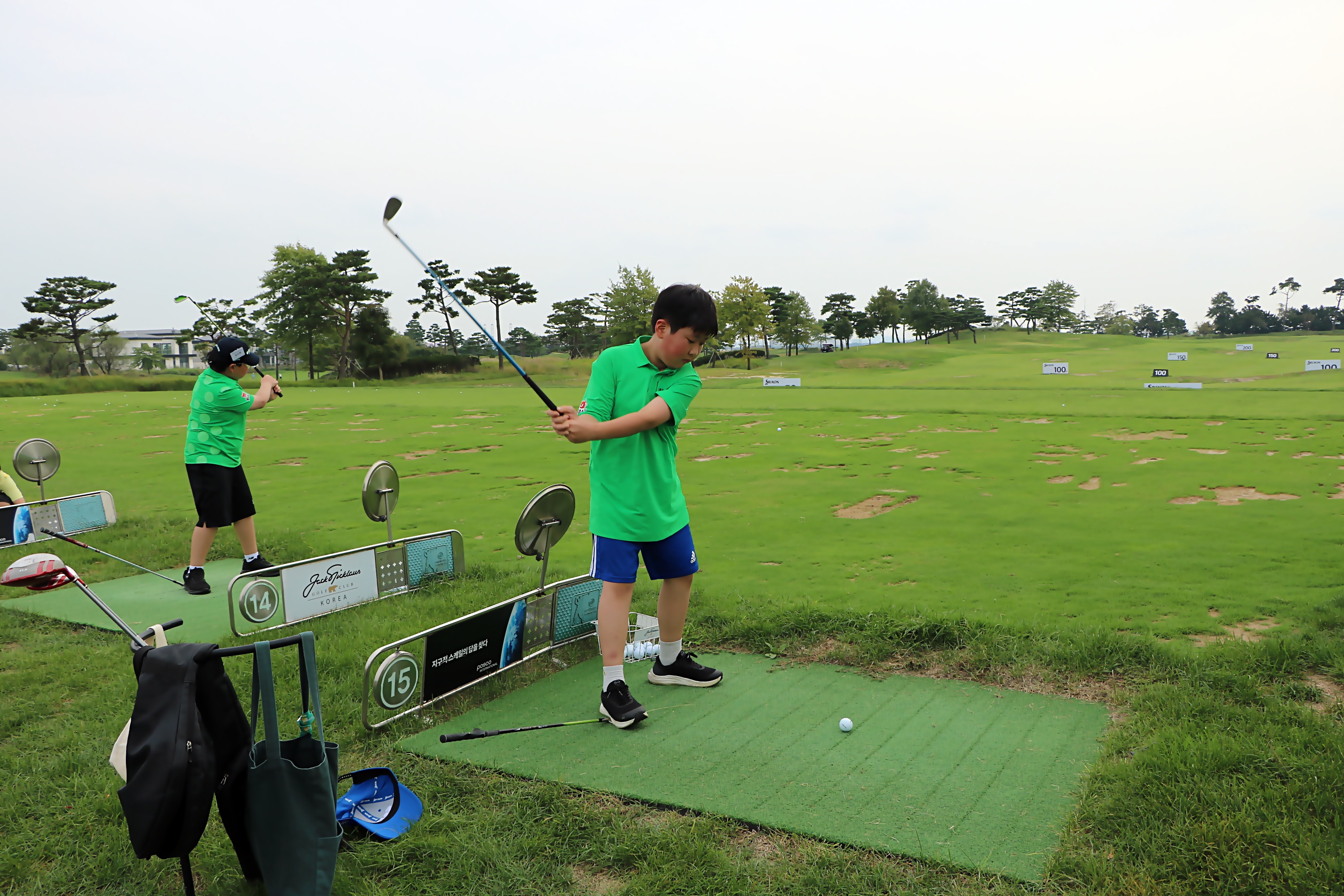 오른발 뒷꿈치를 너무 일찍 들지 않도록 클럽헤드를 밟은 상태에서 스윙연습을 하고 있는 아이들