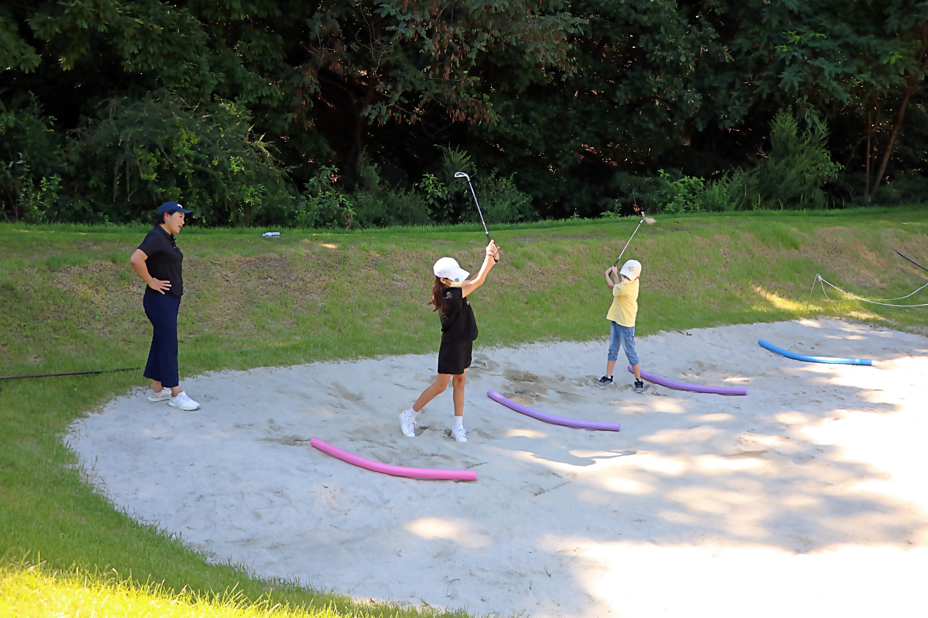 모래 위 스마일 얼굴 지우기를 하며 벙커샷 연습을 하고 있는 모습