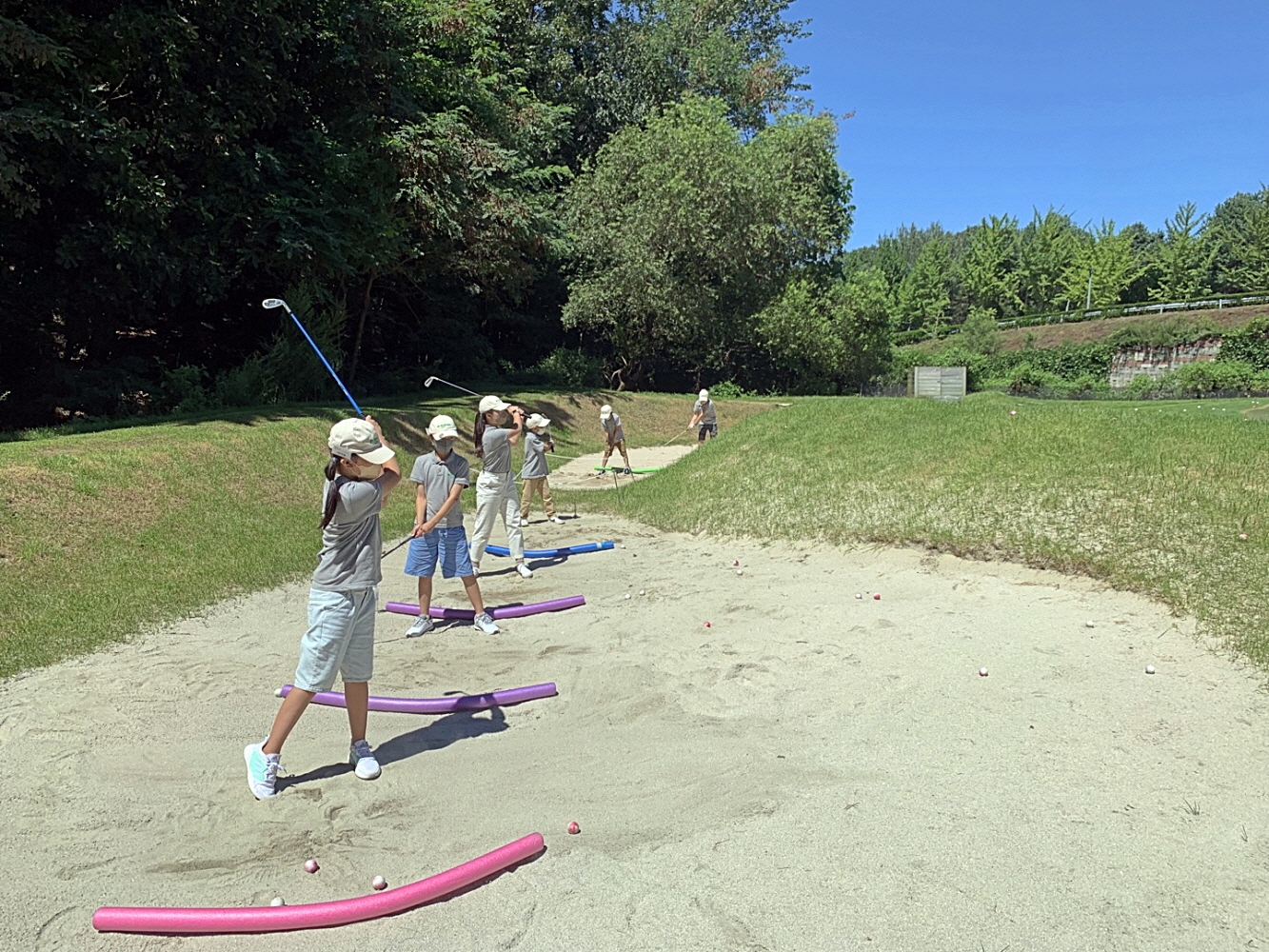 트러블샷 연습의 일환으로 벙커샷을 배우고 있는 교육생들