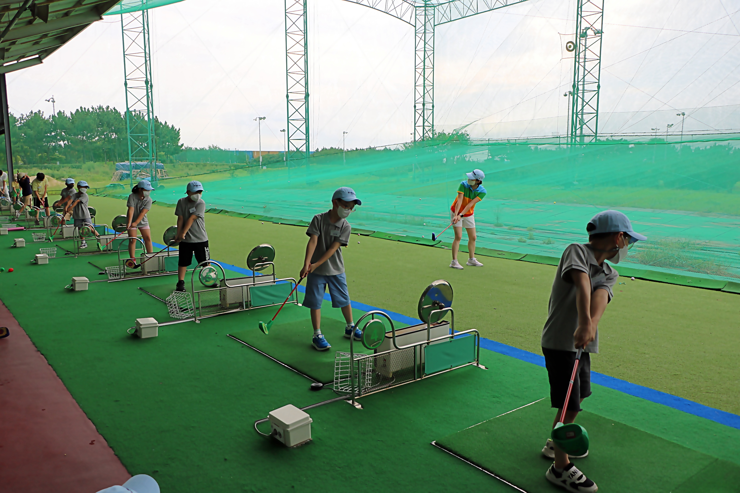 본격적인 스윙 실습에 앞서 빈 스윙으로 골프티를 맞추는 연습을 하고 있는 모습