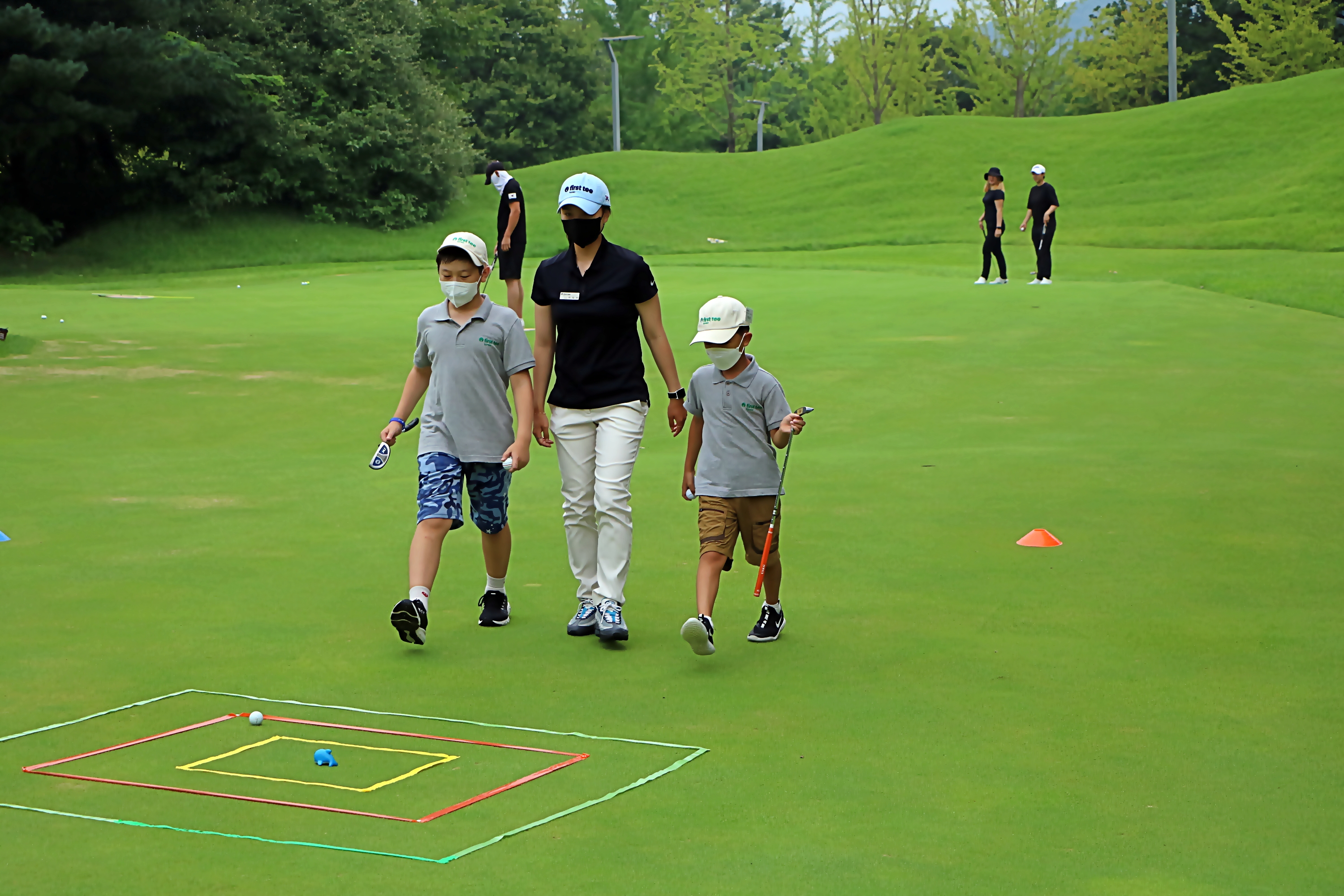 퍼팅 목표까지 거리를 재는 방법에 대해서 가르쳐 주고 있는 모습