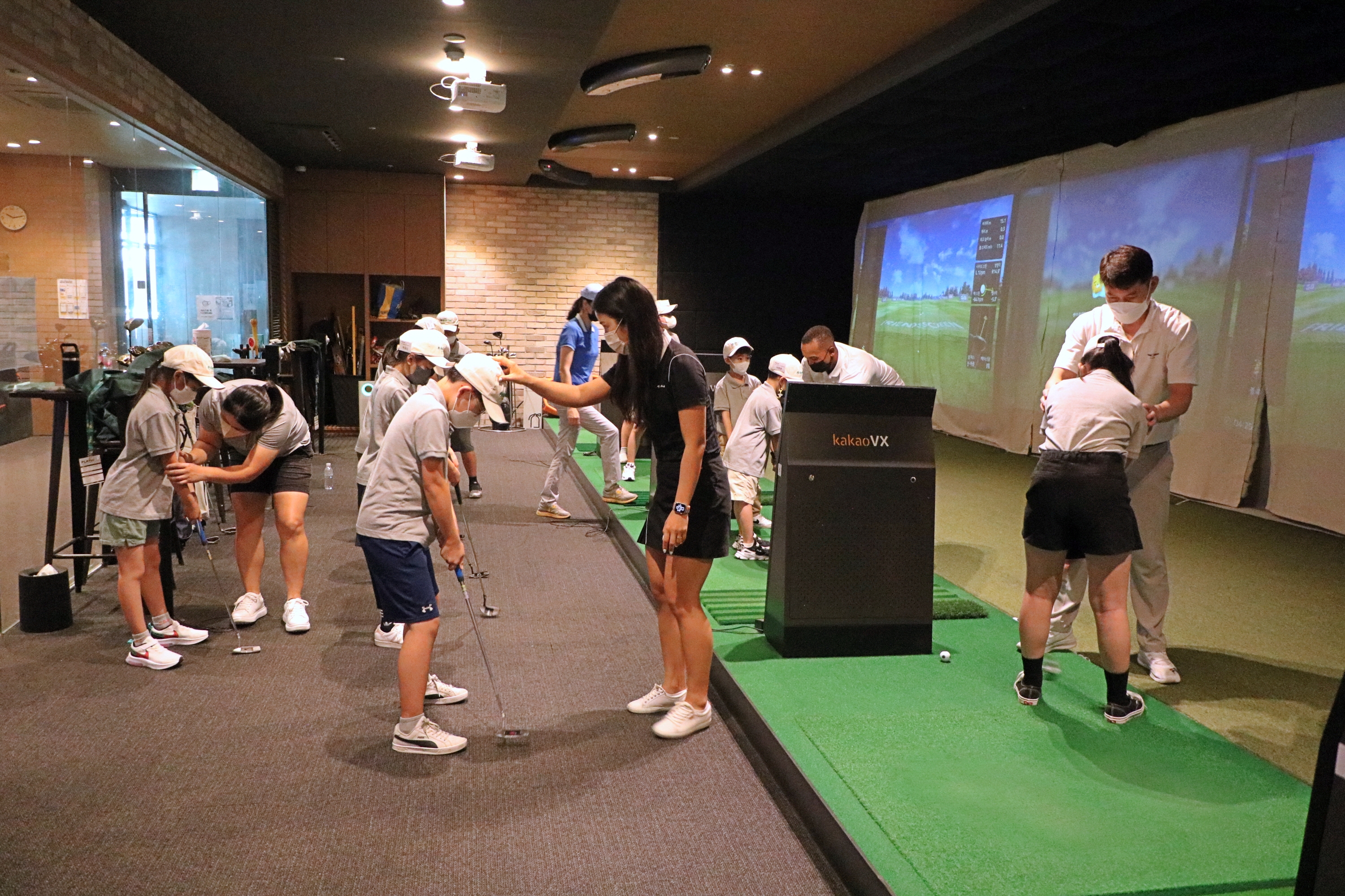 전체적으로 퍼팅에 대한 강의를 들은 뒤 바로 간단하게 따라해보는 가운데 교정해 주고 있는 모습