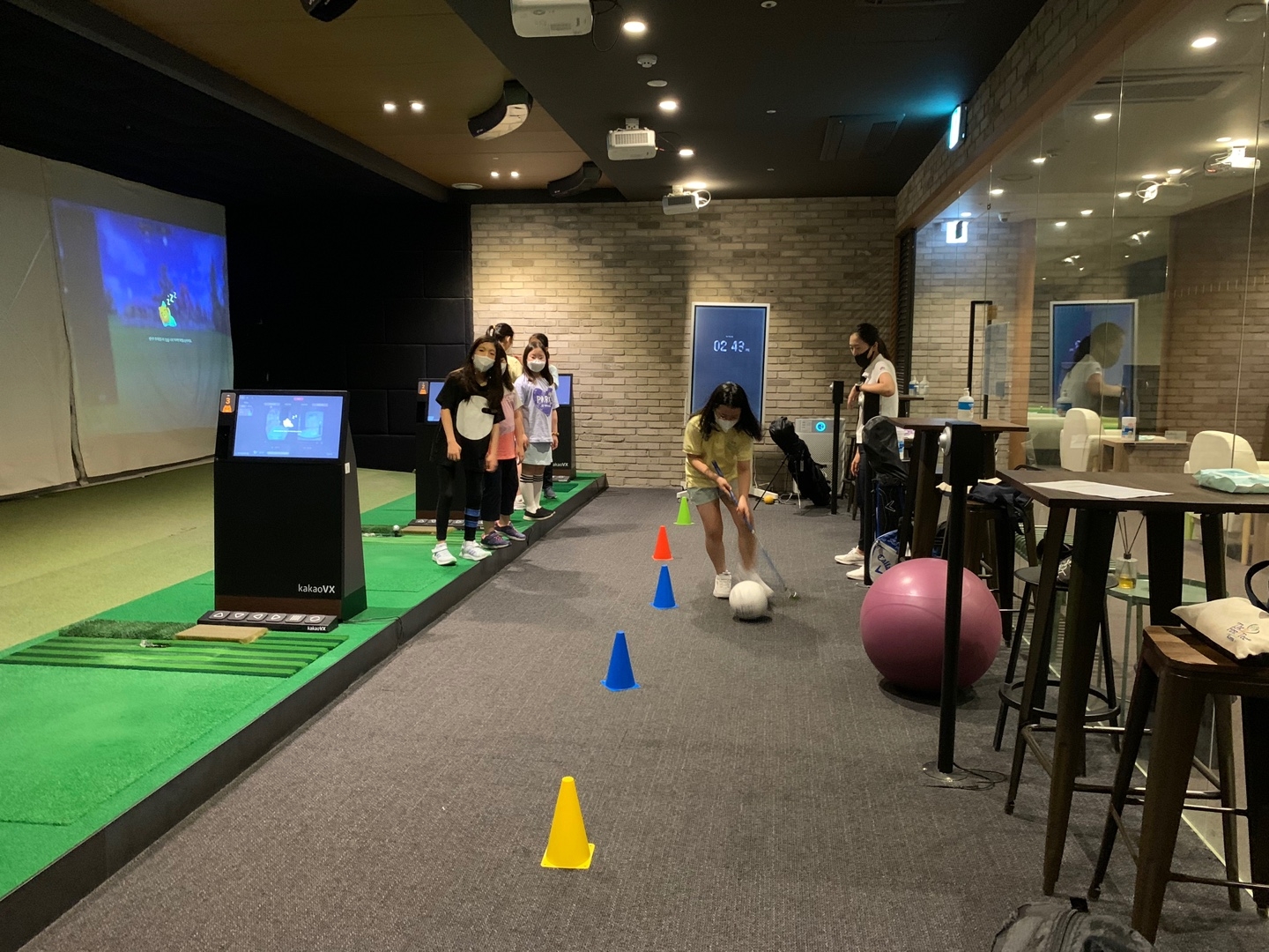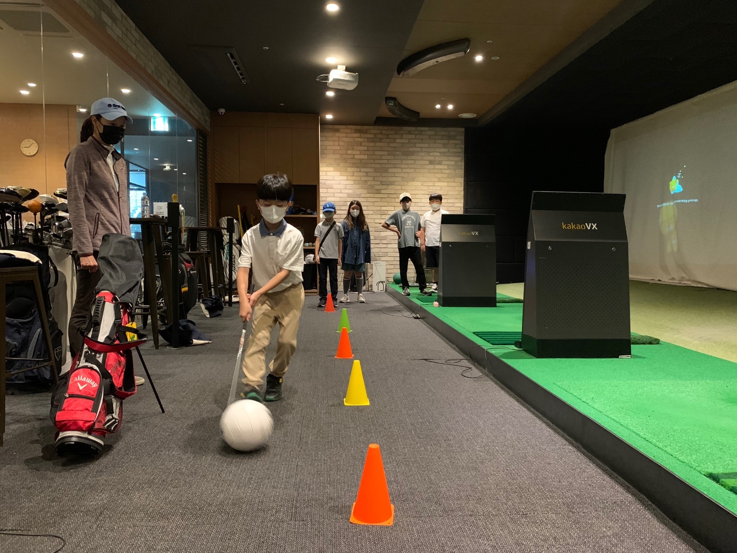 간단한 게임을 통해 골프클럽에 대한 친숙도를 높이고 있는 아이들