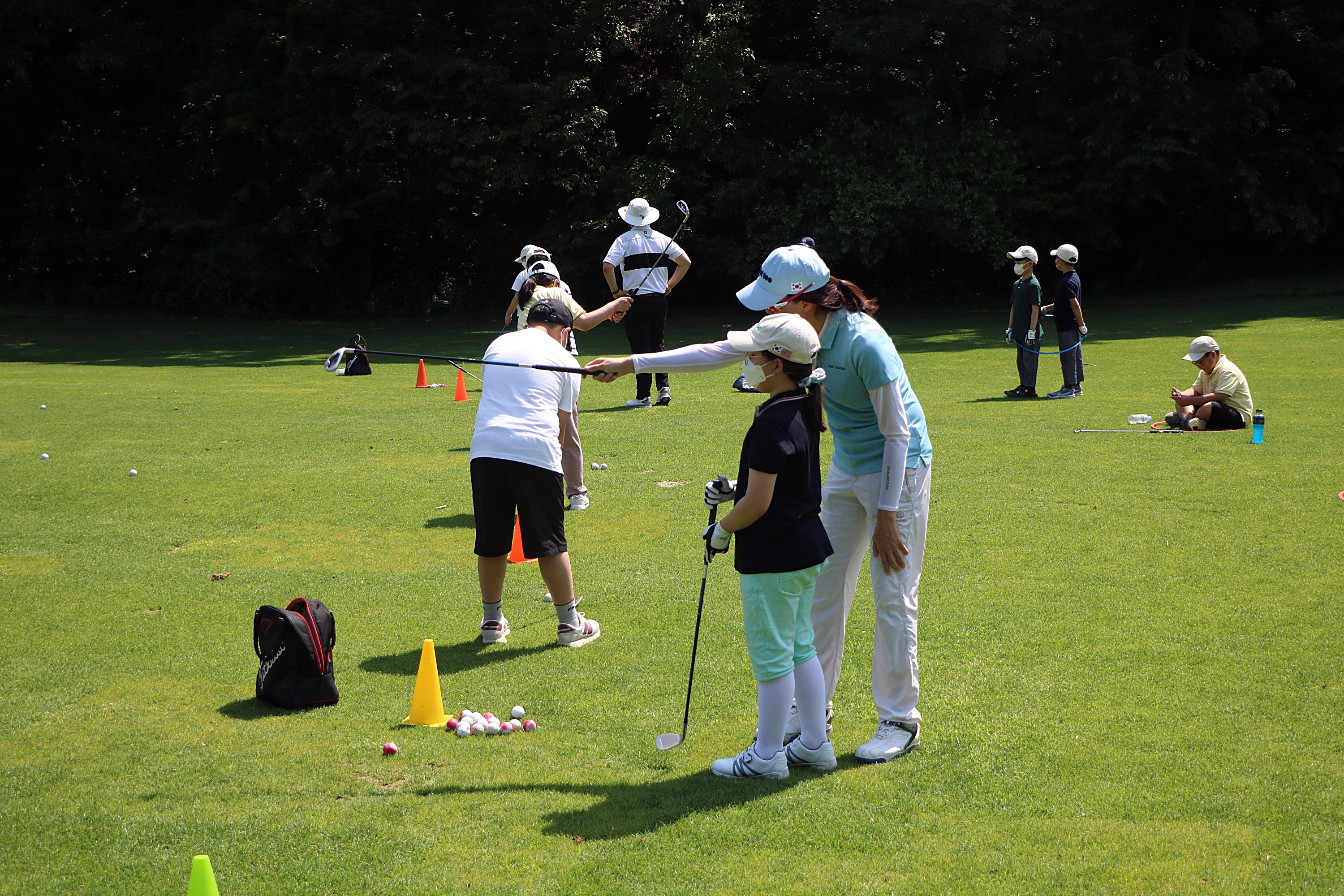 목표방향 설정 후 올바르게 어드레스 서는 법에 대해서 설명해 주고 있는 모습