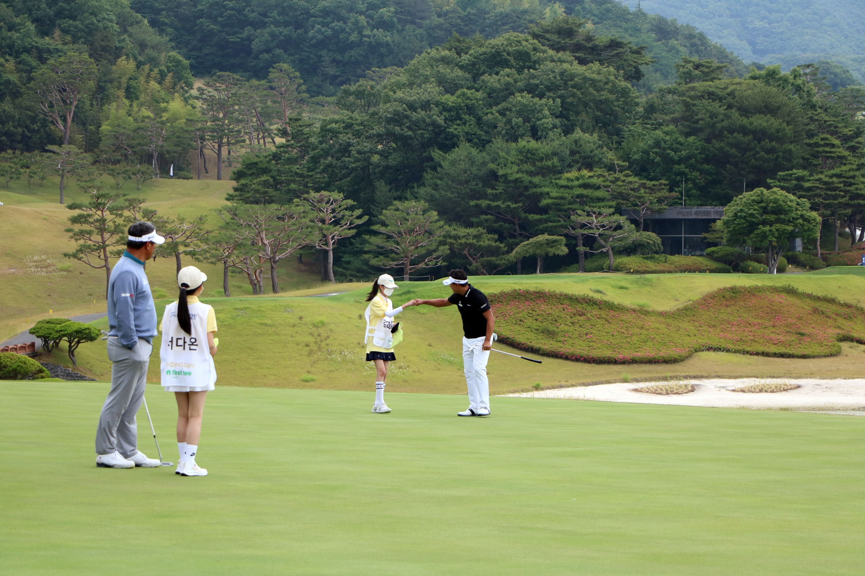 홀인에 성공한 뒤 박상현 선수와 화이팅을 하는 퍼스트 티 참가생