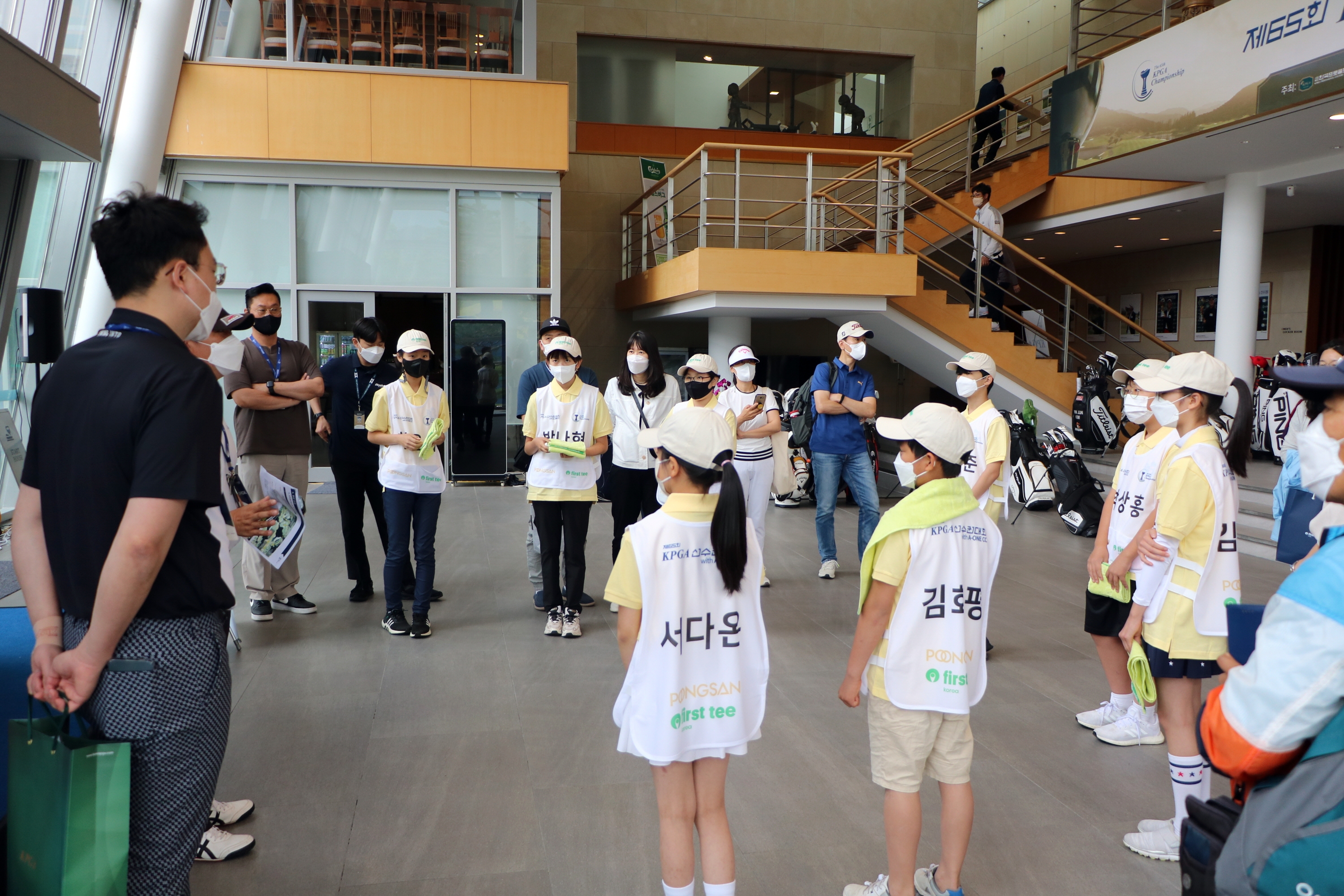 니어핀 대회 및 캐디체험시 유의사항에 대해 설명해 주고 있는 모습