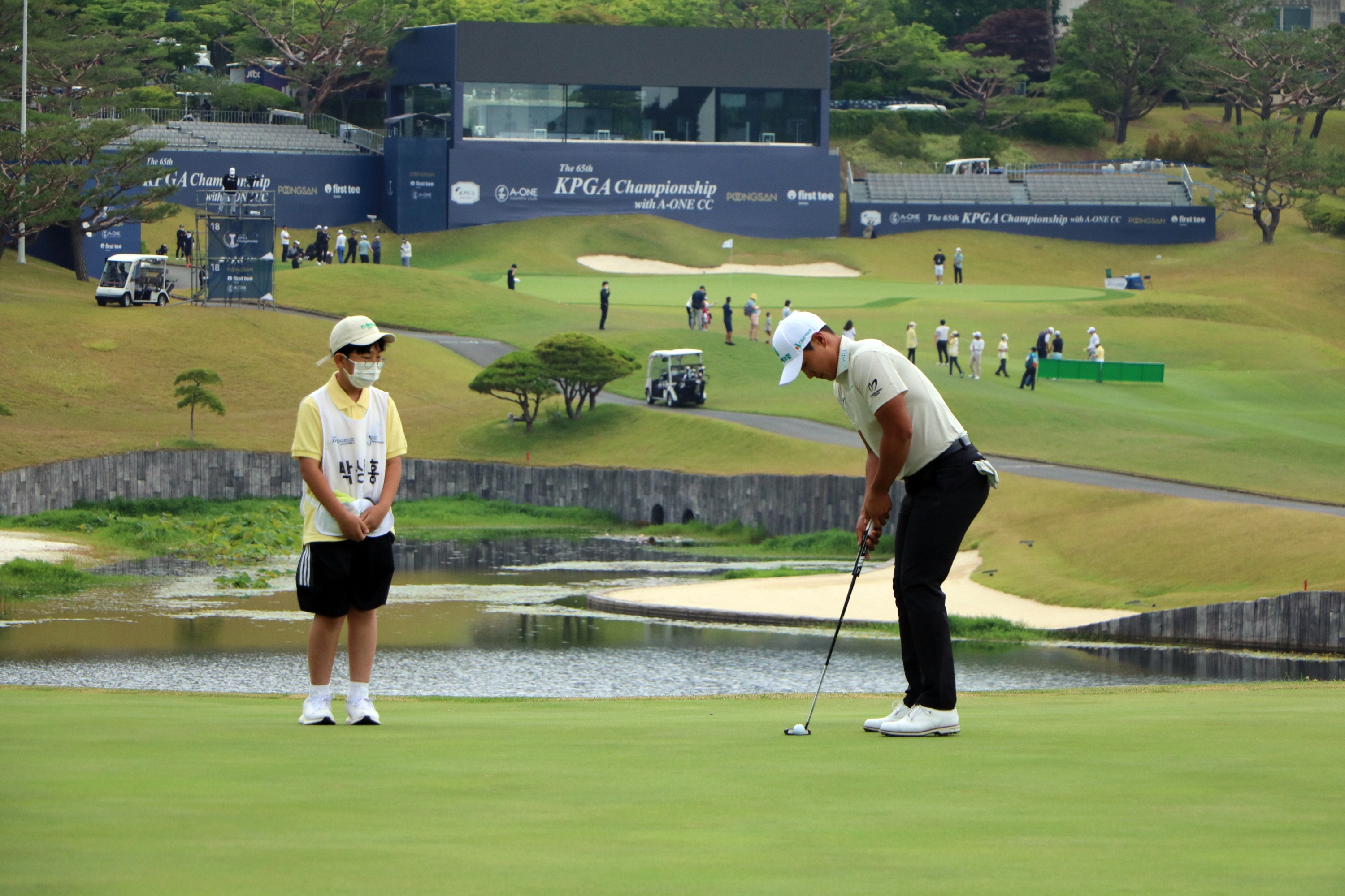 서요섭 선수의 퍼팅하는 과정을 옆에서 지켜보고 있는 퍼스트 티 참가생 모습