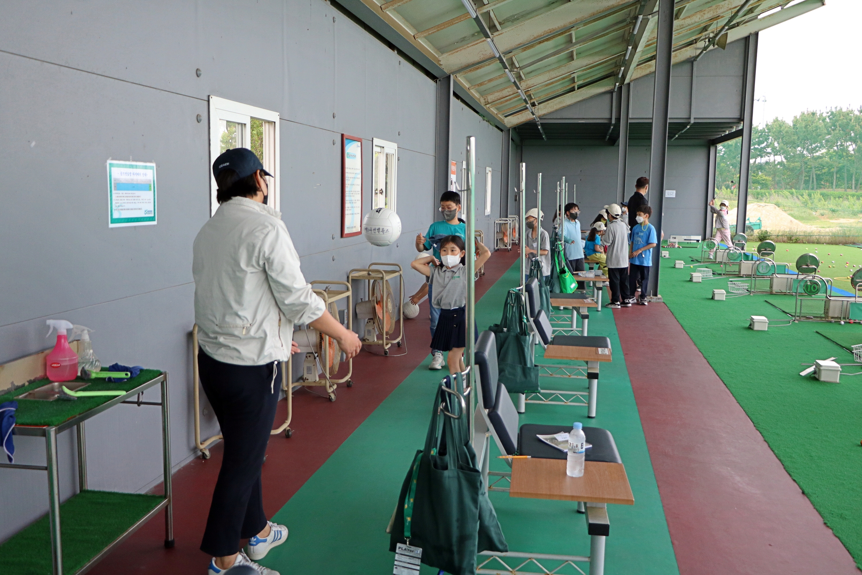 골프스윙 자세로 배구공을 옆으로 코치님께 던지며 스윙의 기본 개념을 배우고 있는 모습