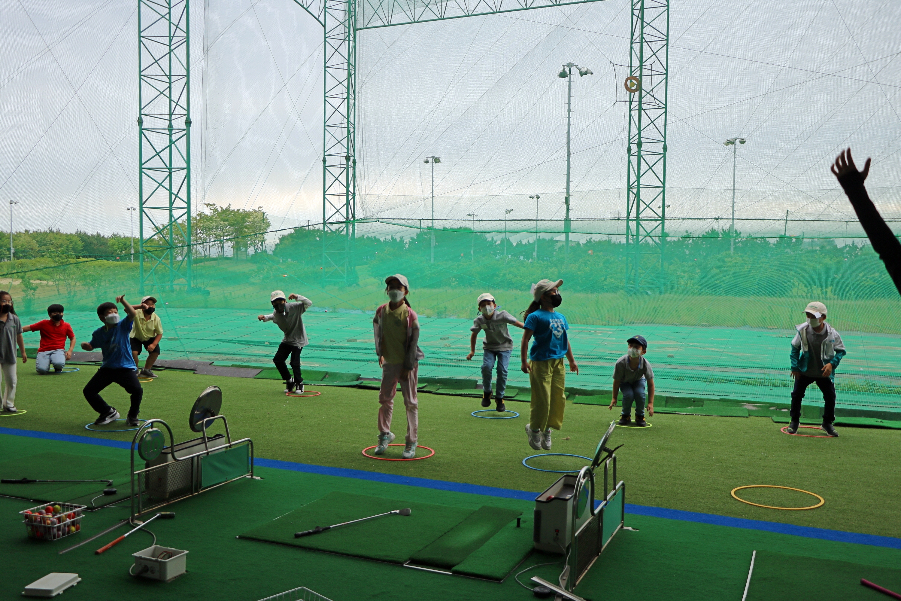 코치님의 신호에 맞춰 제자리 점프를 하며 몸을 풀고 있는 아이들
