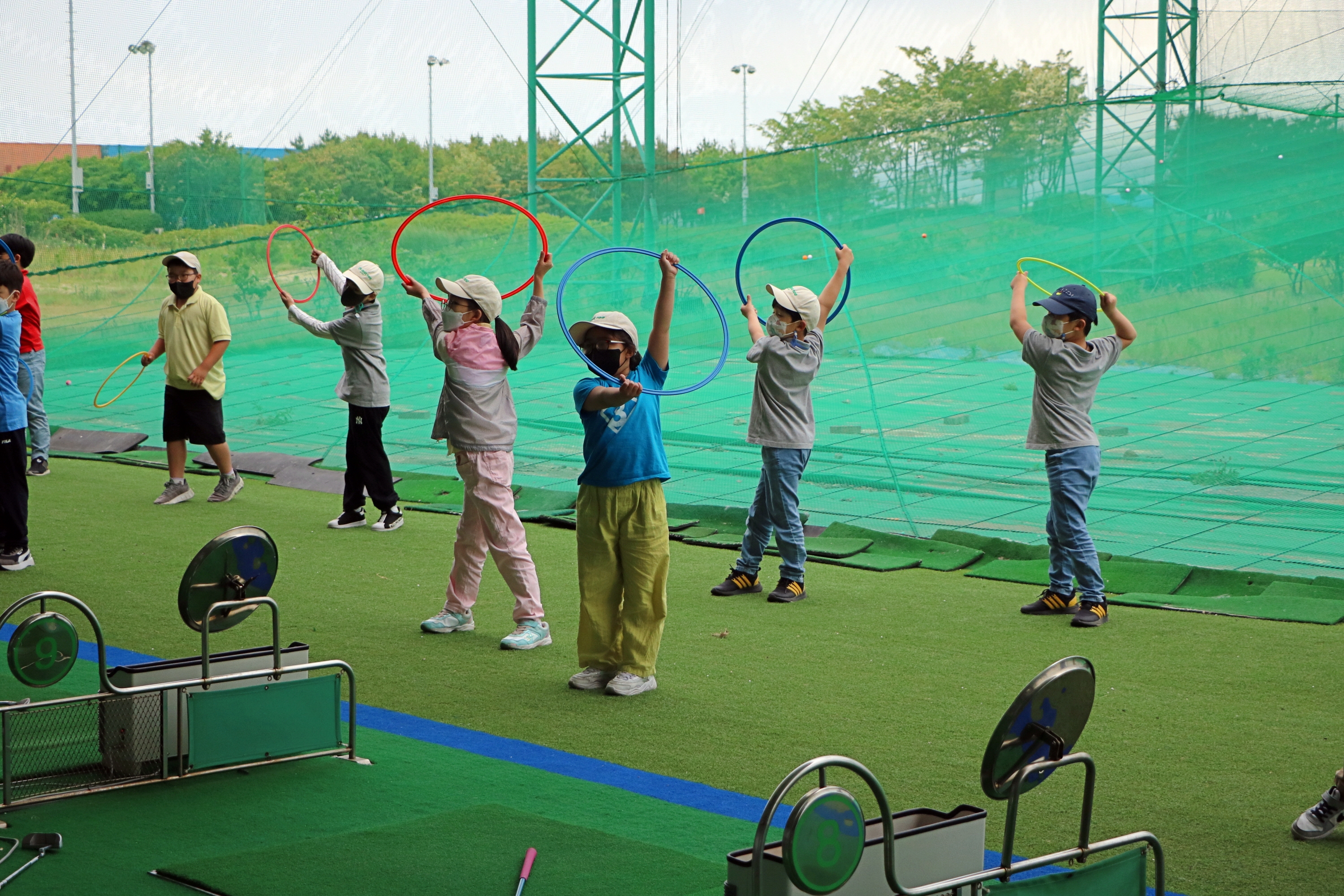 골프스윙을 익히기 위한 동작을 진지하게 따라하고 있는 아이들