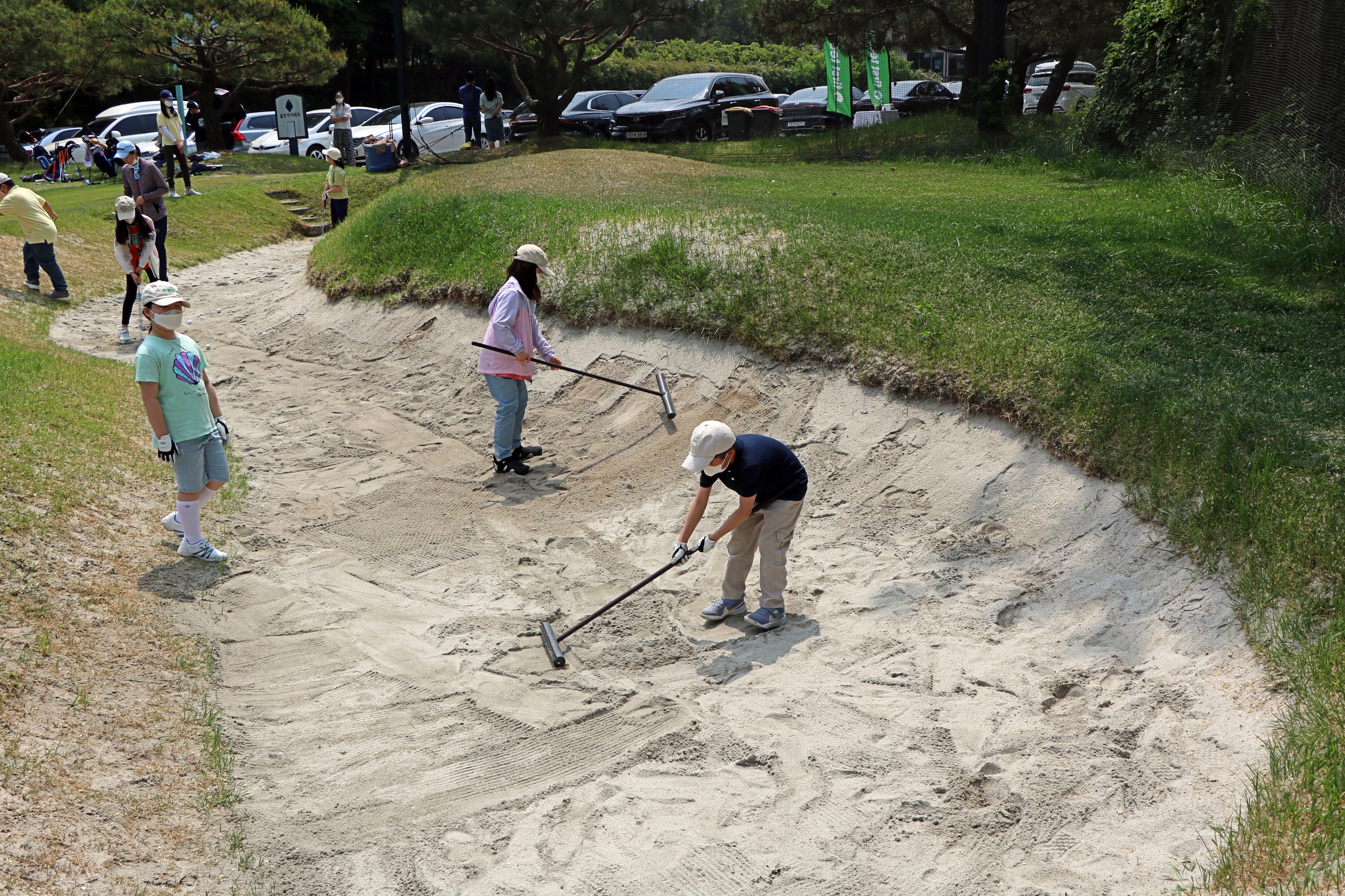 벙커샷 연습 후 발자국 등을 정리하고 있는 모습