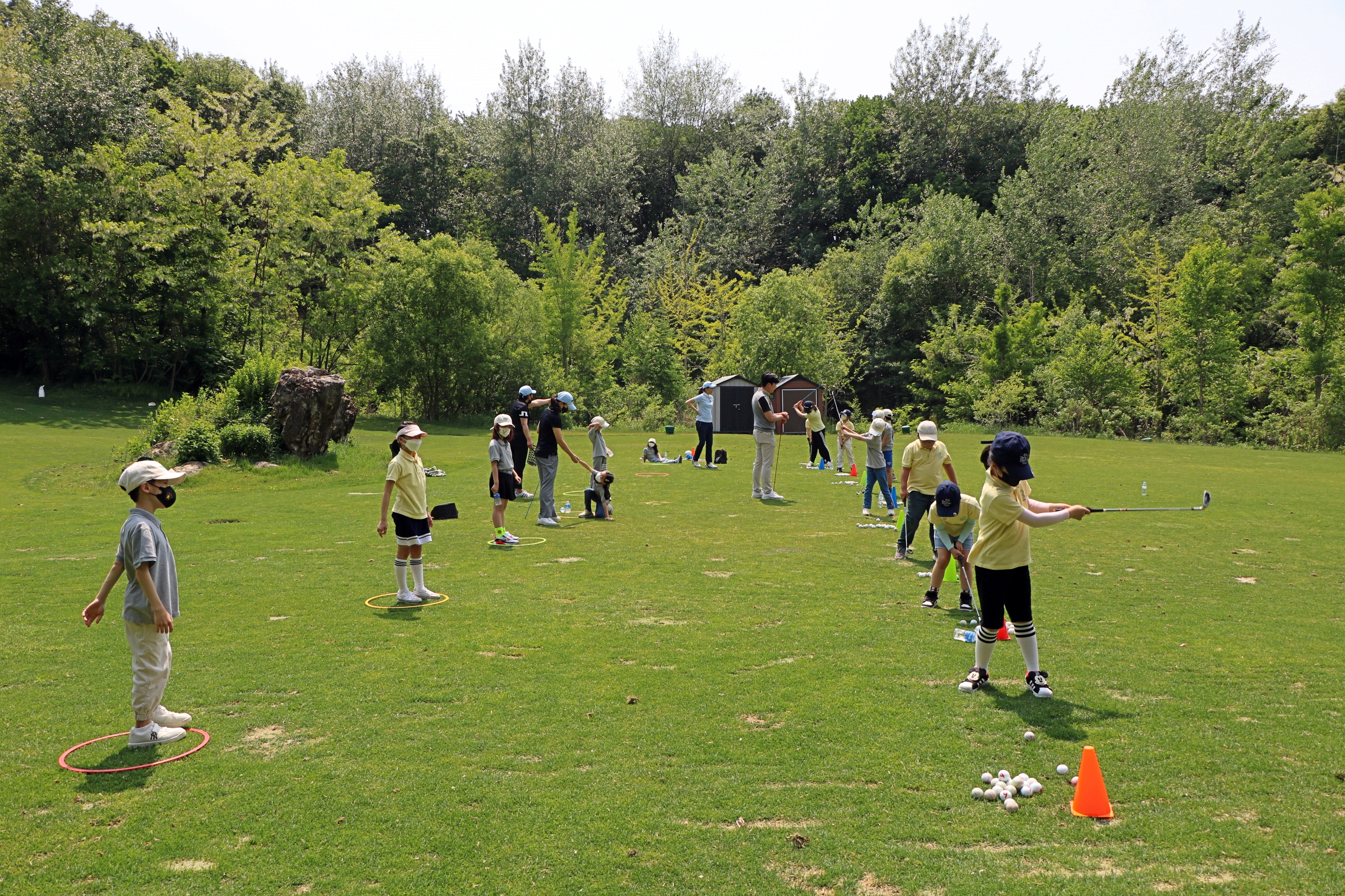 2인 1조로 칩샷 실습을 하고 있는 아이들