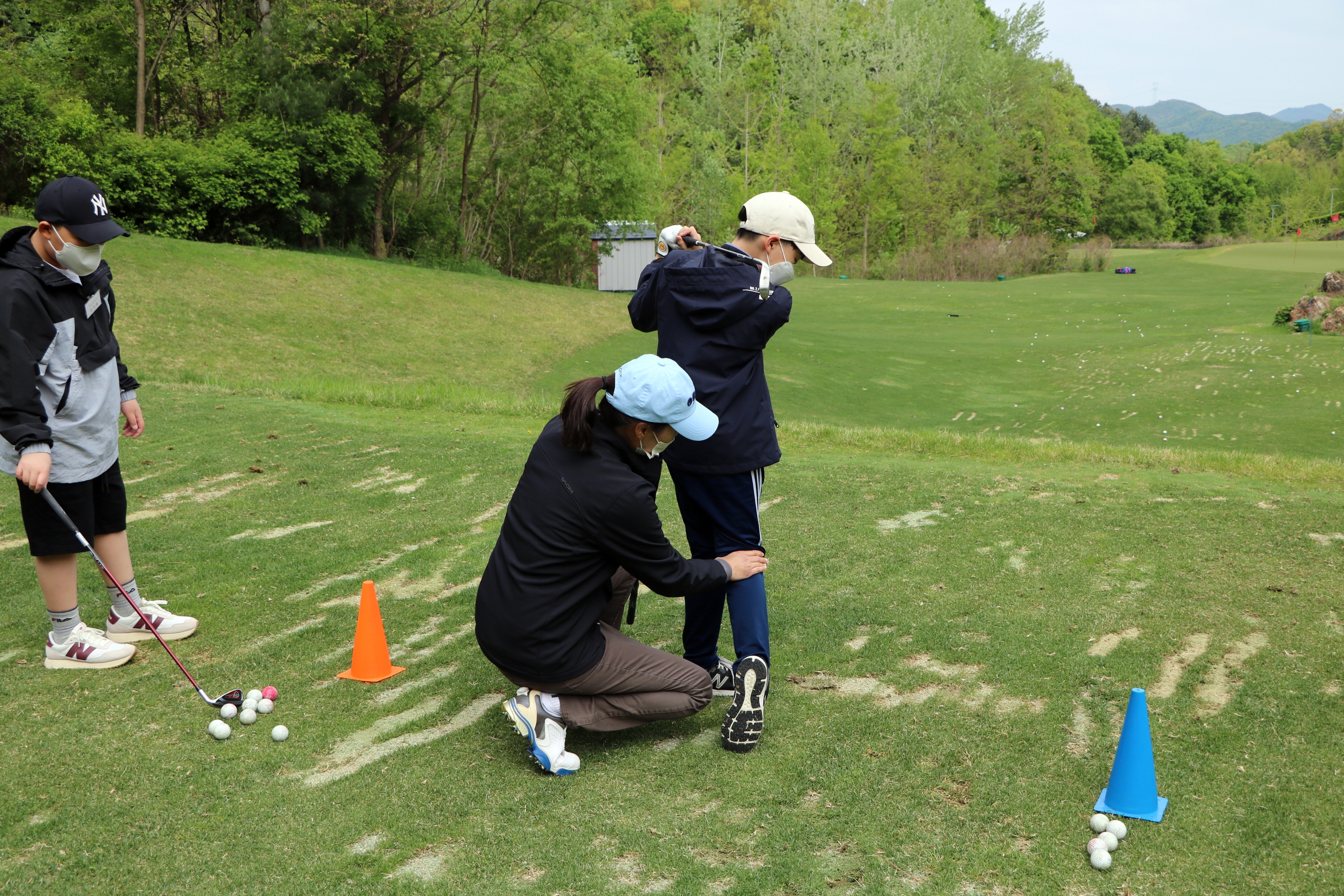 피니쉬 할 때 오른발 모양을 교정해 주고 계신 코치님