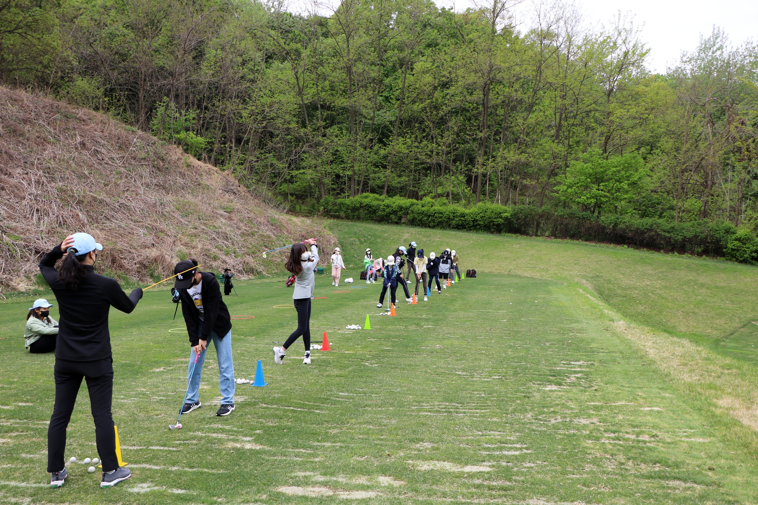 실제 잔디밭에서 풀스윙 실습을 해보고 있는 아이들
