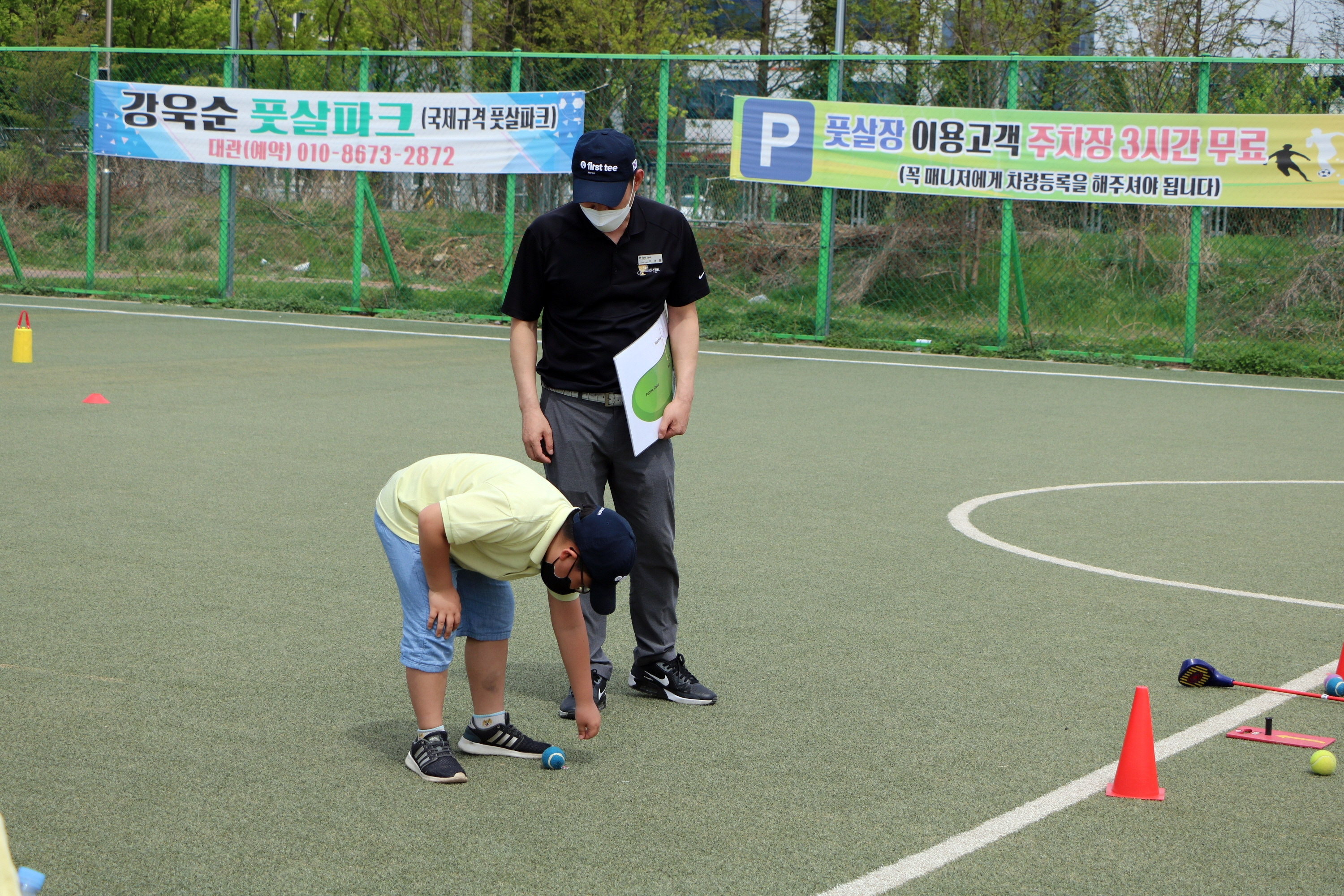 퍼팅실습에 앞서 볼마크 하는 법에 대해 코치님의 설명을 듣고 다른 친구들에게 시범을 보여주고 있는 교육생