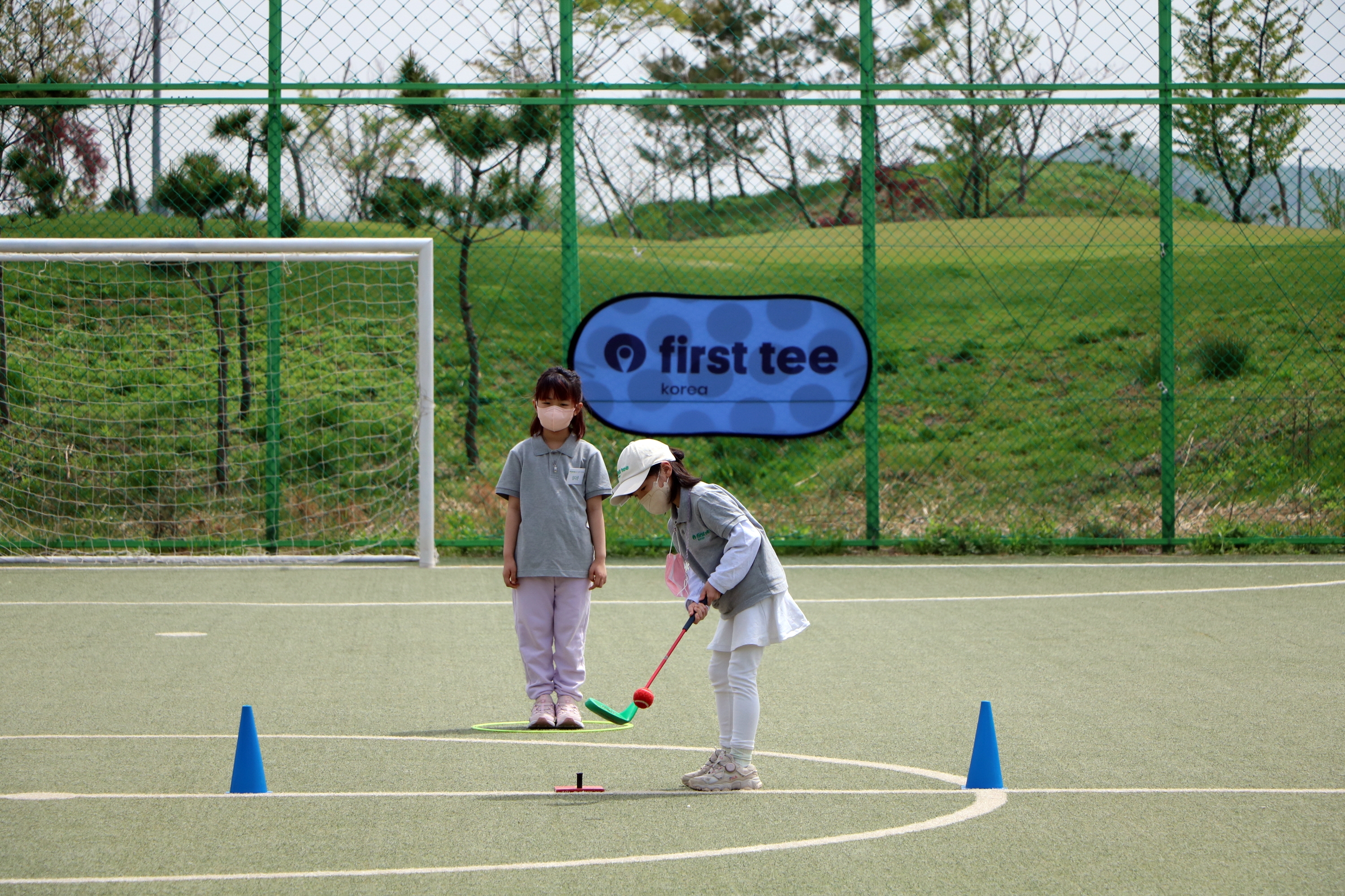 수업 중 안전을 위해 항상 골프실습을 하는 인원 외에는 안전구역에 있어야 하는 룰을 준수하고 있는 아이들