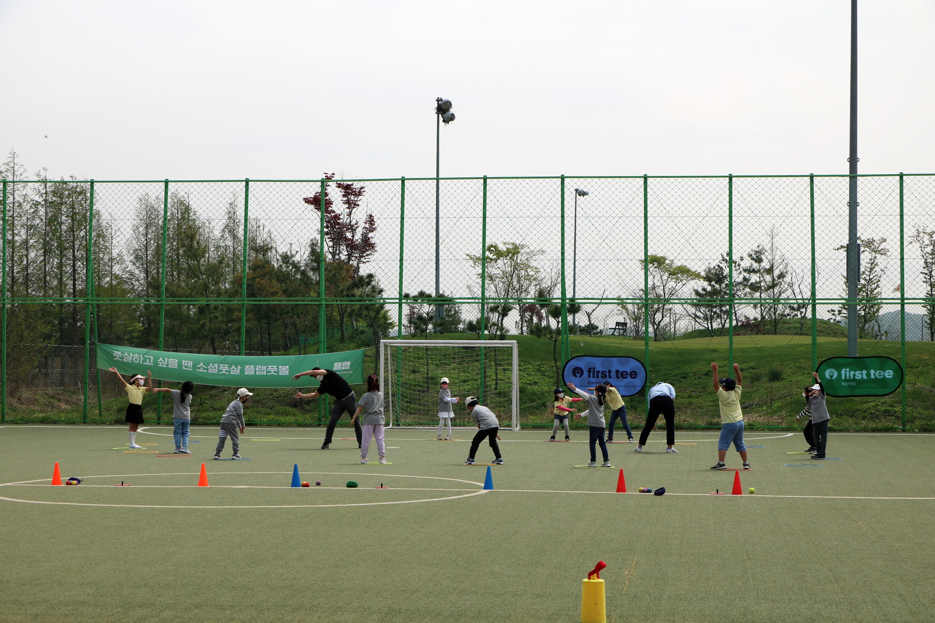 부상방지를 위해 본격적인 골프실습에 앞서 코치님을 따라 몸풀기를 하고 있는 아이들