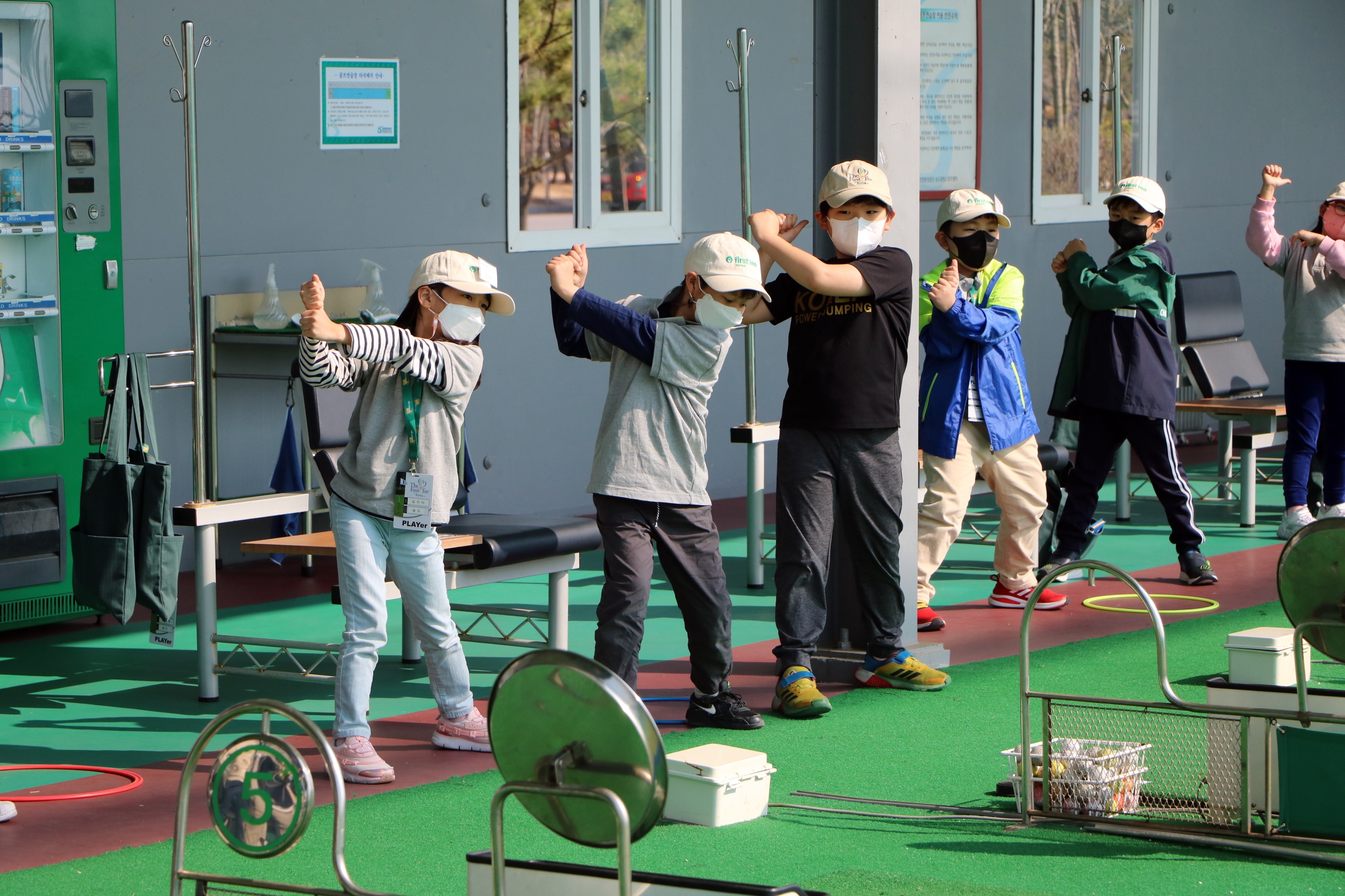 올바른 백스윙 동작을 하는 방법에 대해서 배운 뒤 직접 따라해보는 아이들