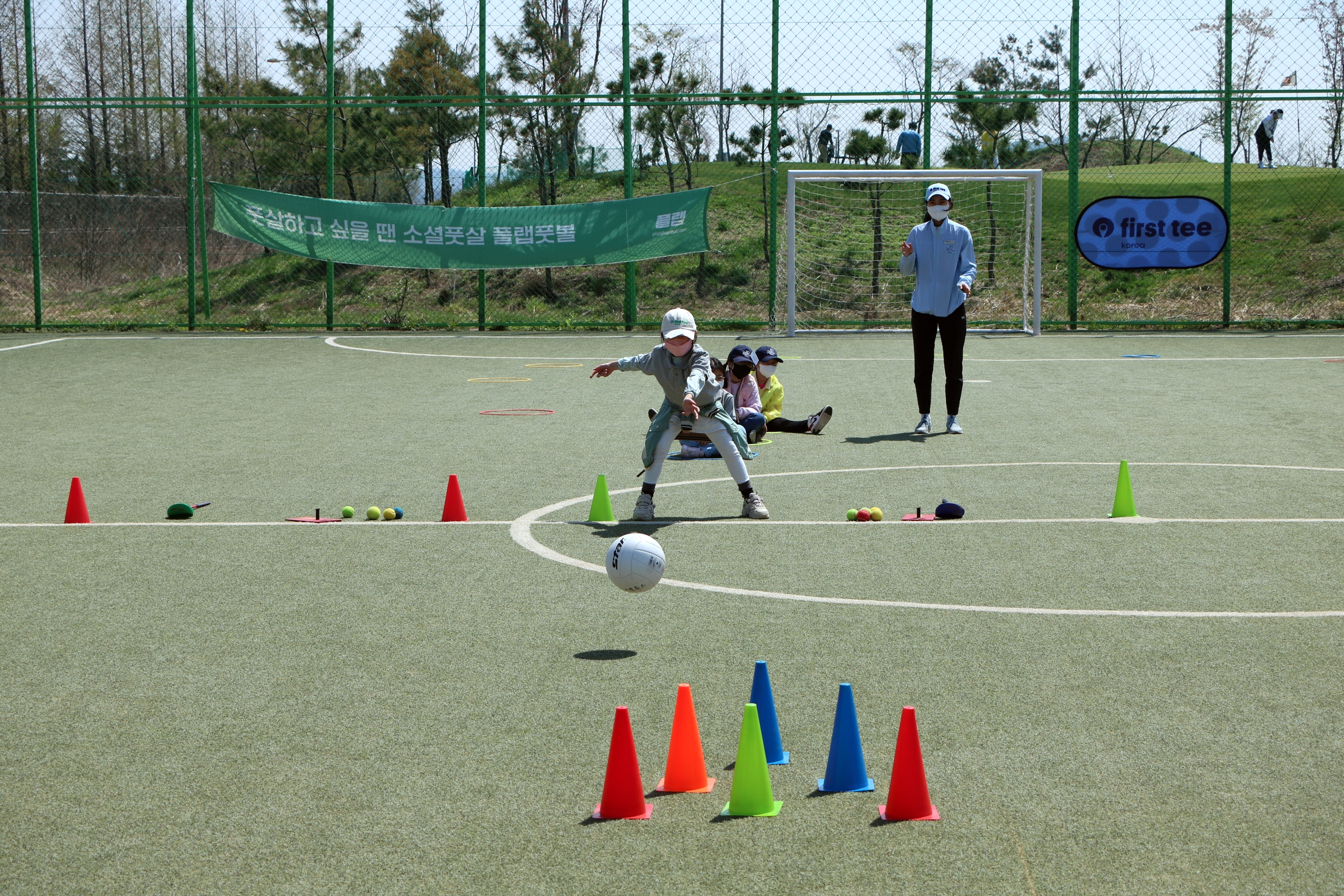 배구공으로 팀 대항 볼링을 하면서 단합심을 키우고 있는 아이들