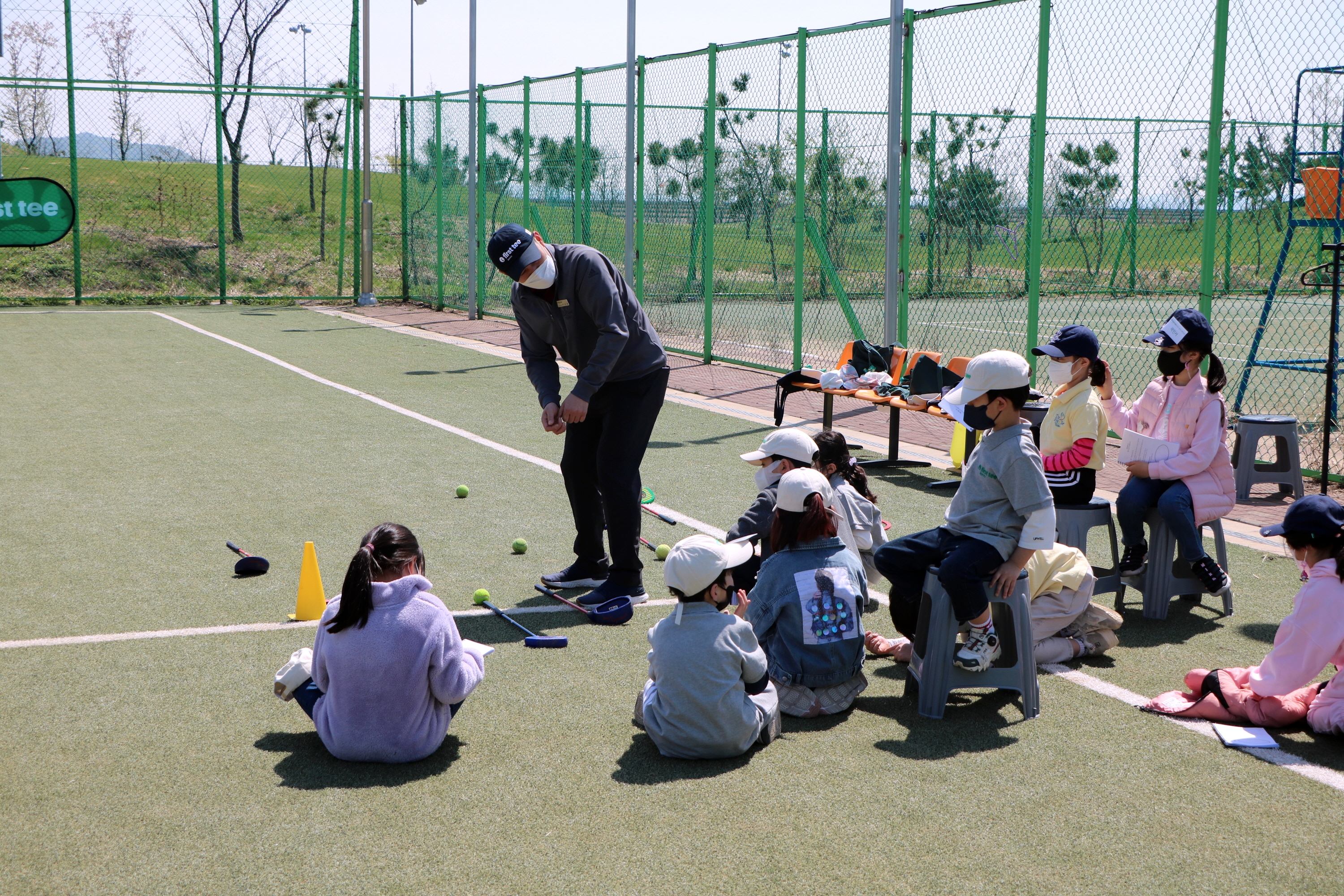 퍼팅실습에 앞서 퍼팅하는 요령에 대해서 설명해 주고 있는 모습