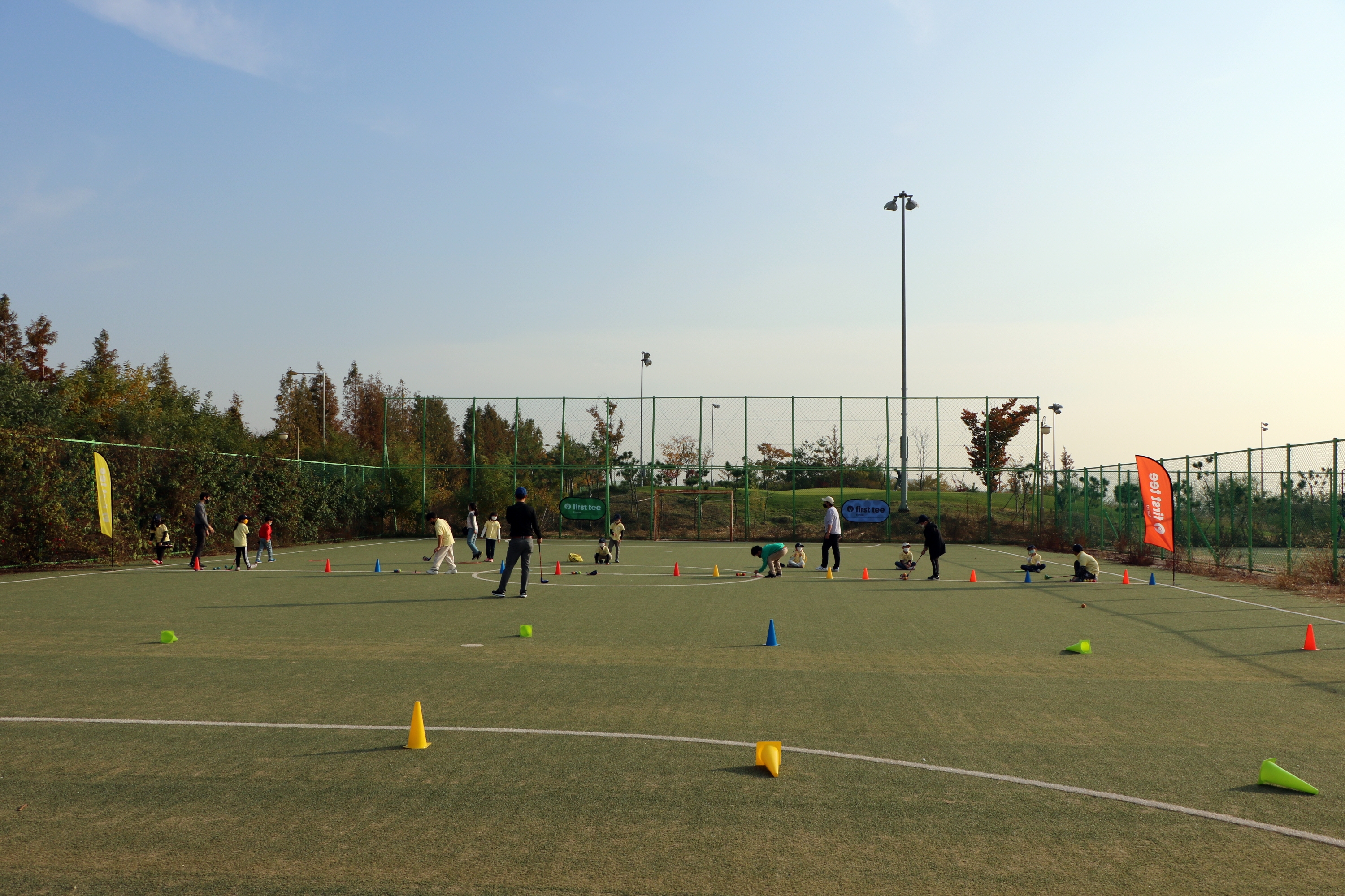 전방에 있는 고깔 맞추기 게임을 통해 재밋게 골프를 배우고 있는 모습