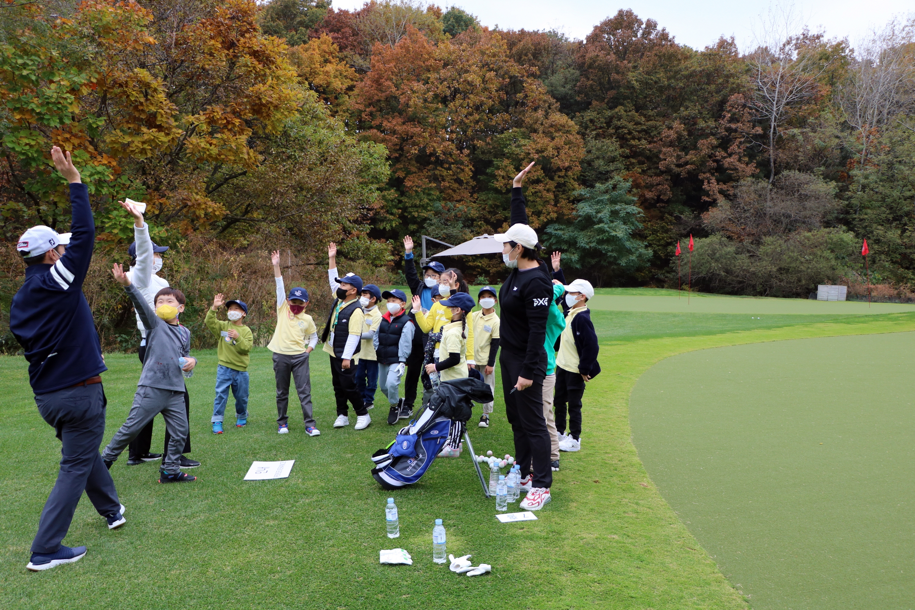 수업을 마무리 하며 퍼스트 티 코리아 화이팅을 외치면서 에어하이파이브를 하고 있는 아이들