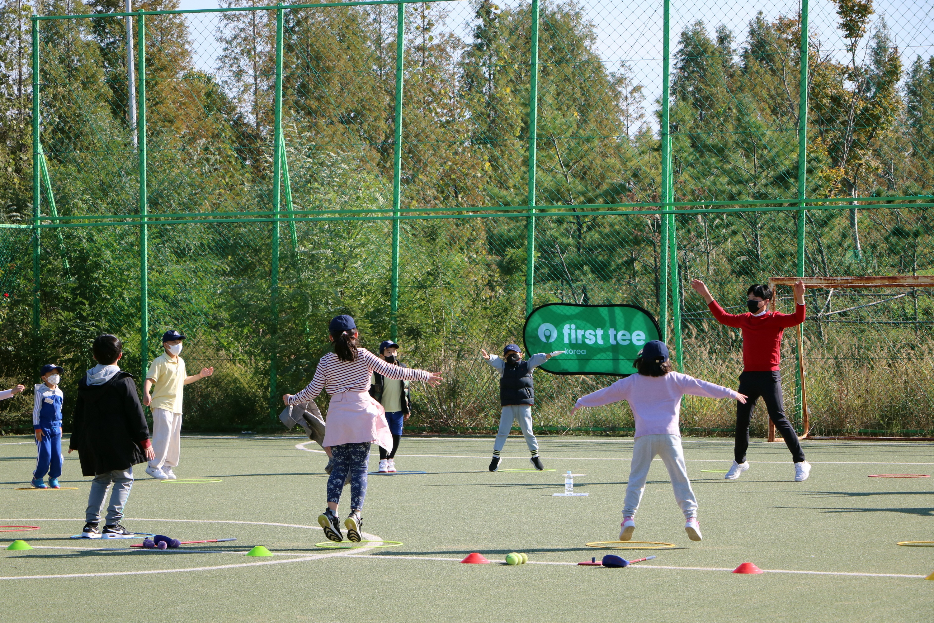 양팔 벌려 제자리 높이뛰기를 하면서 몸을 풀고 있는 아이들
