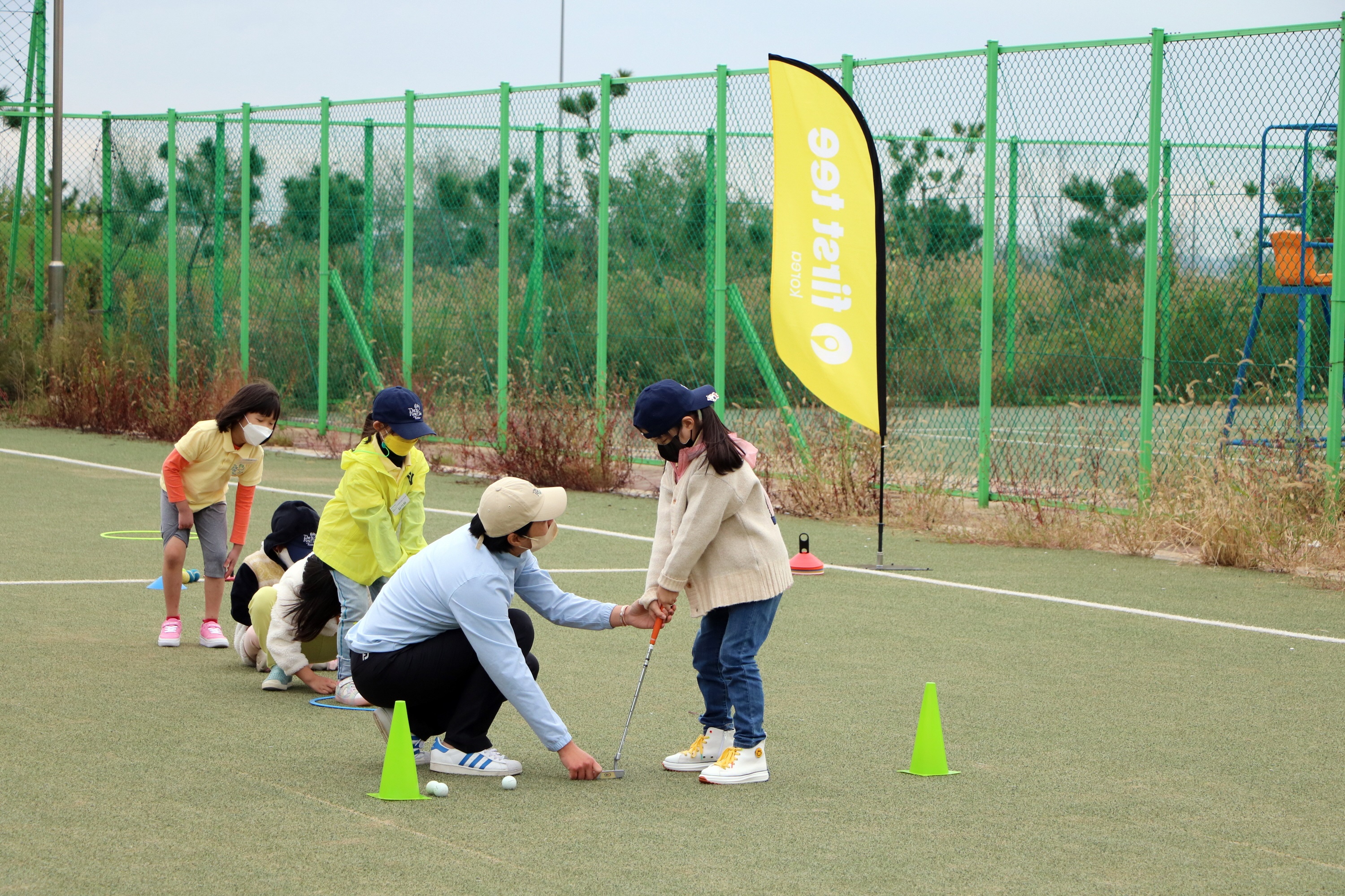 퍼팅 하는 요령에 대해서 자세히 가르쳐 주고 있는 모습