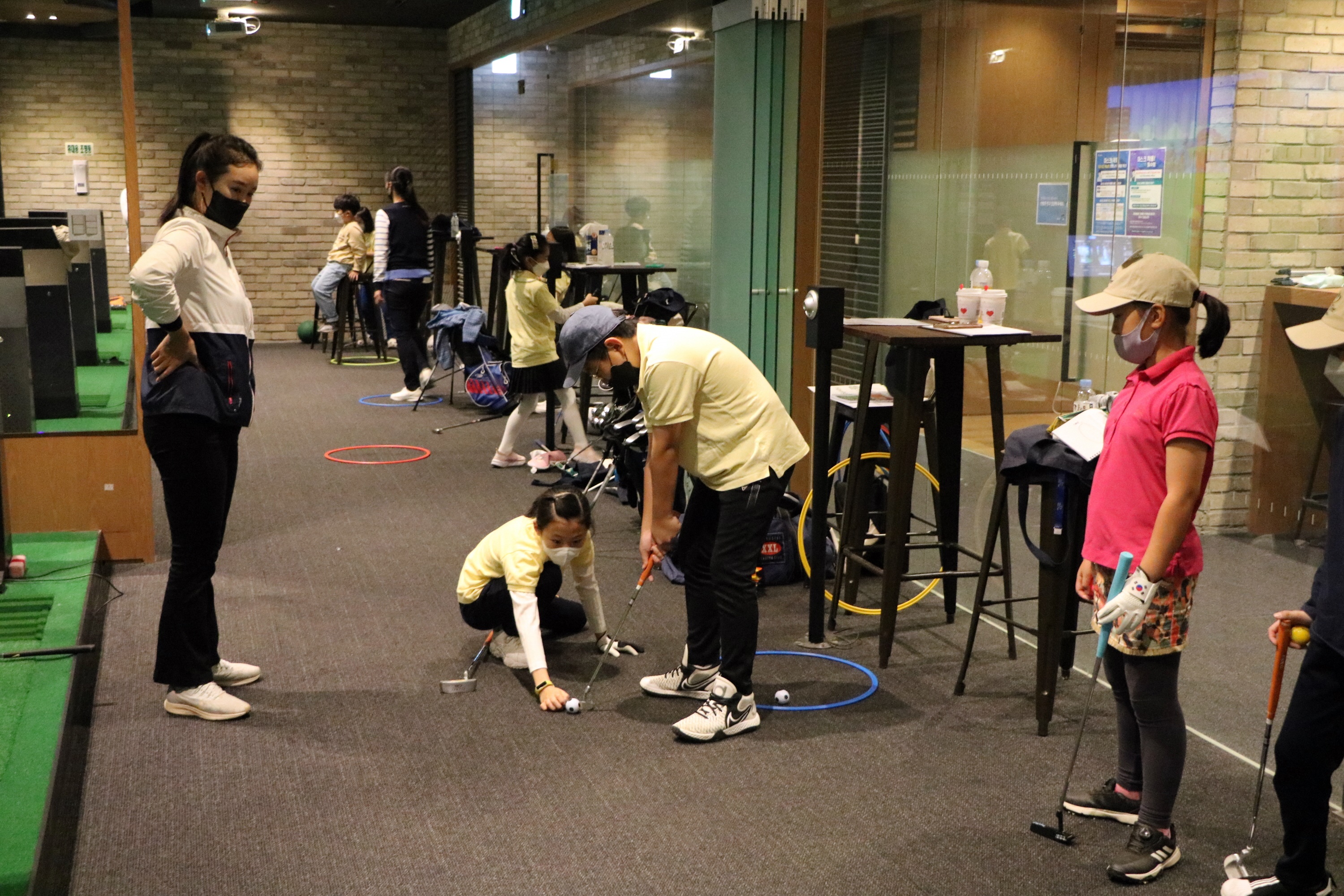 2인 1조로 퍼팅 대회를 하면서 서로 같은 팀끼리 조언해 주고 있는 모습