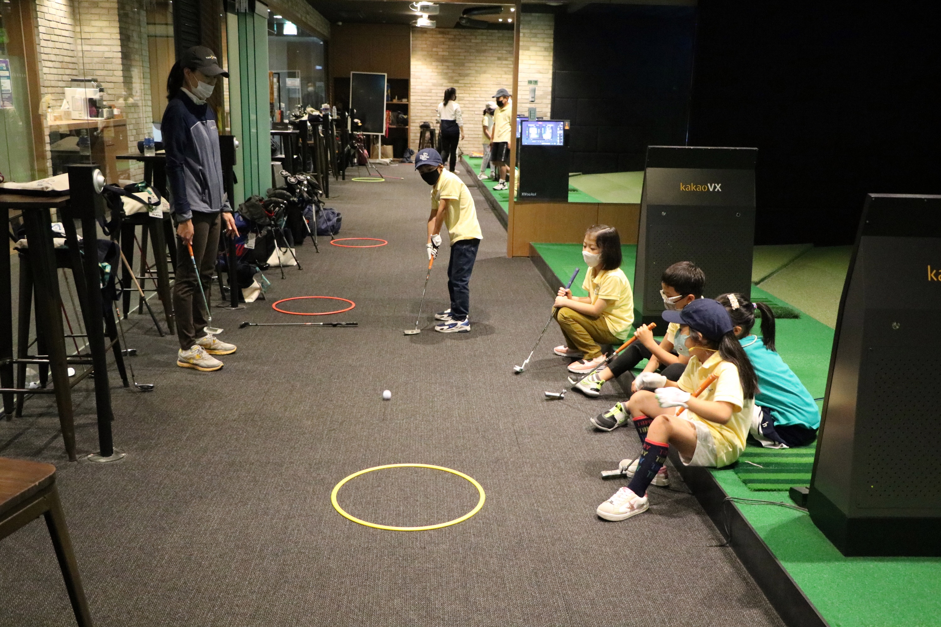퍼팅으로 전방에 있는 원안에 공을 넣는 게임을 하고 있는 아이들