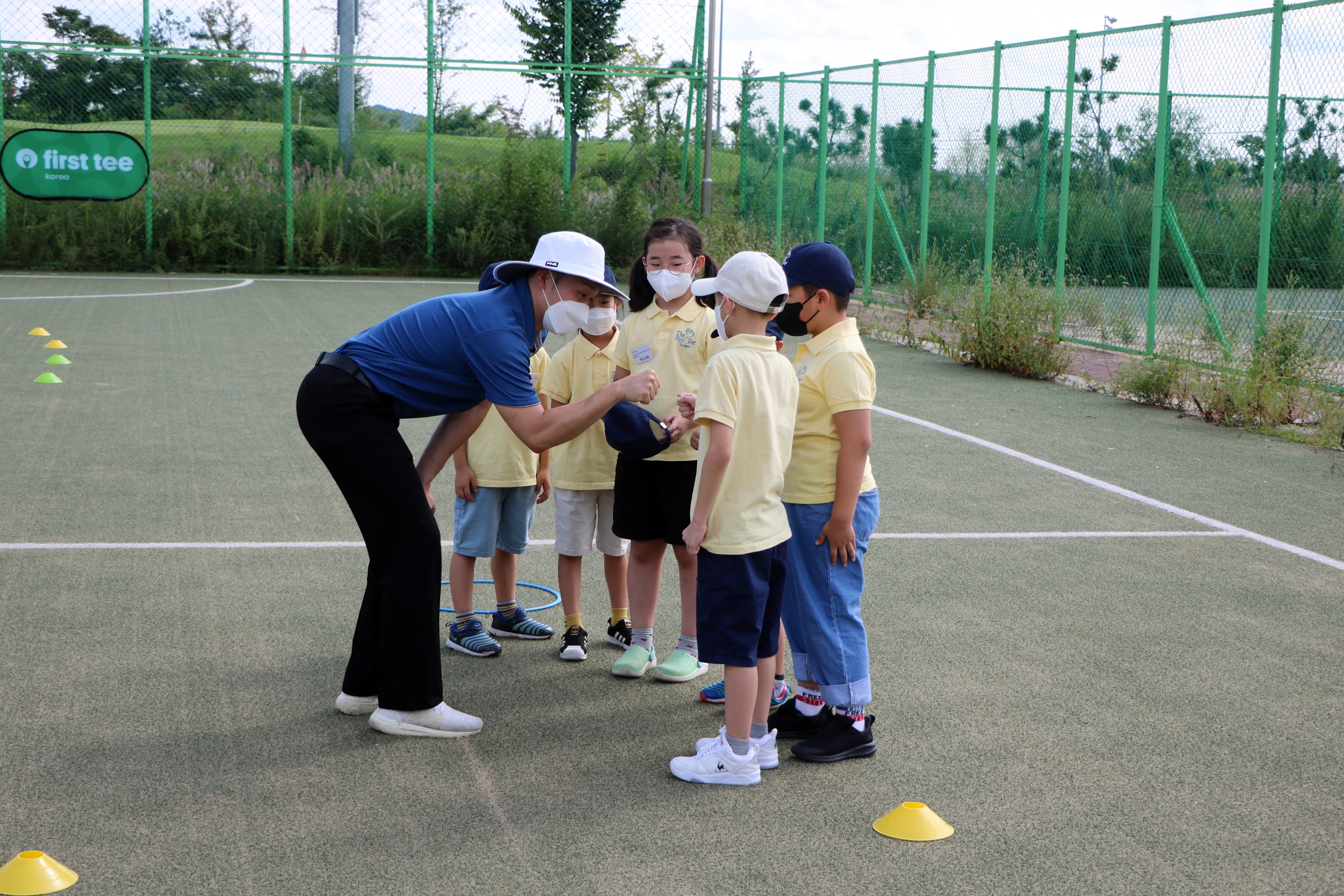 예의를 실천하기 위해 코스에 나가더라도 서로 주먹악수를 하며 코로나 19 예방에 신경써야 함을 강조하는 코치