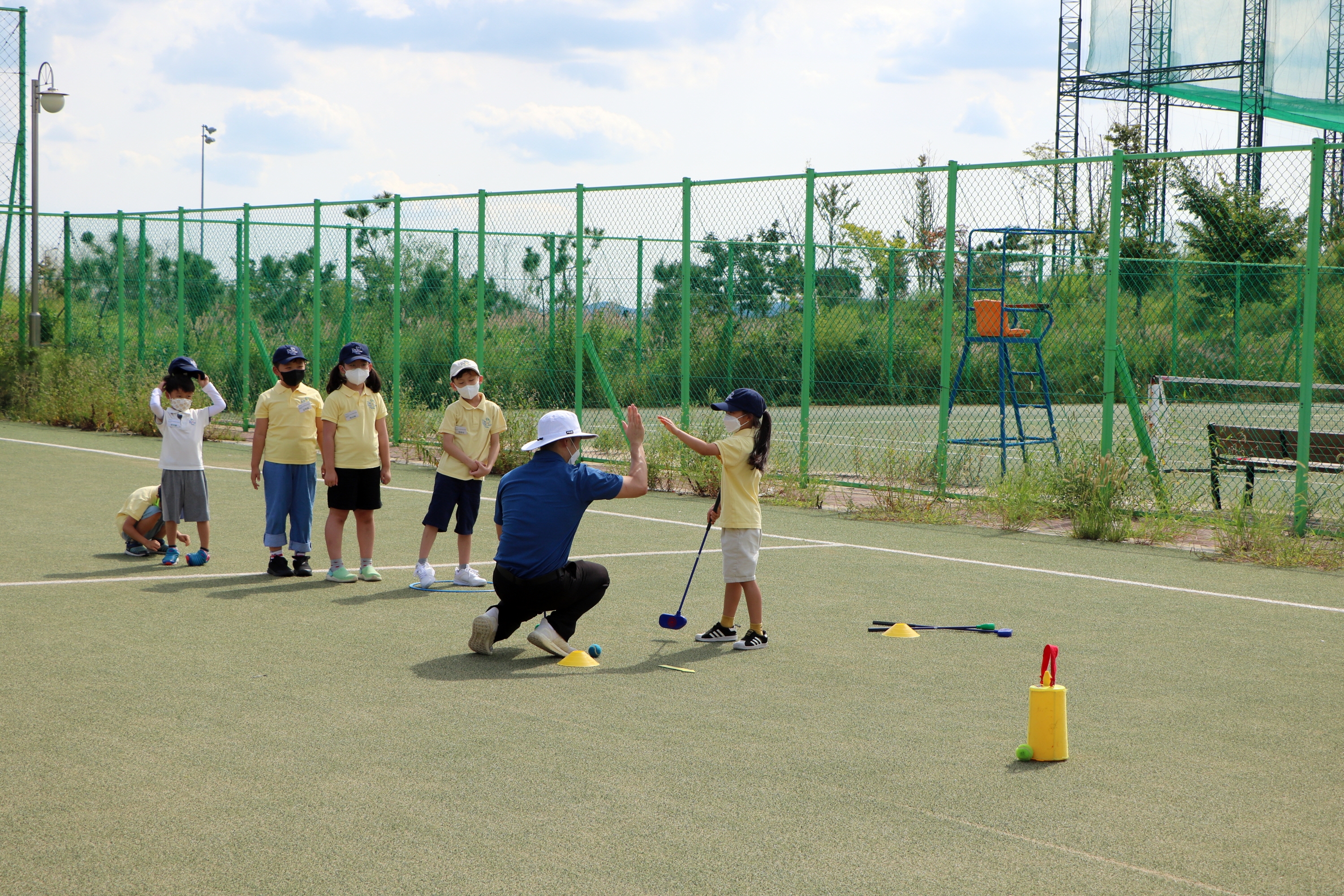 목표물에 공을 붙인 뒤 코치님과 하이파이브를 하는 교육생 모습