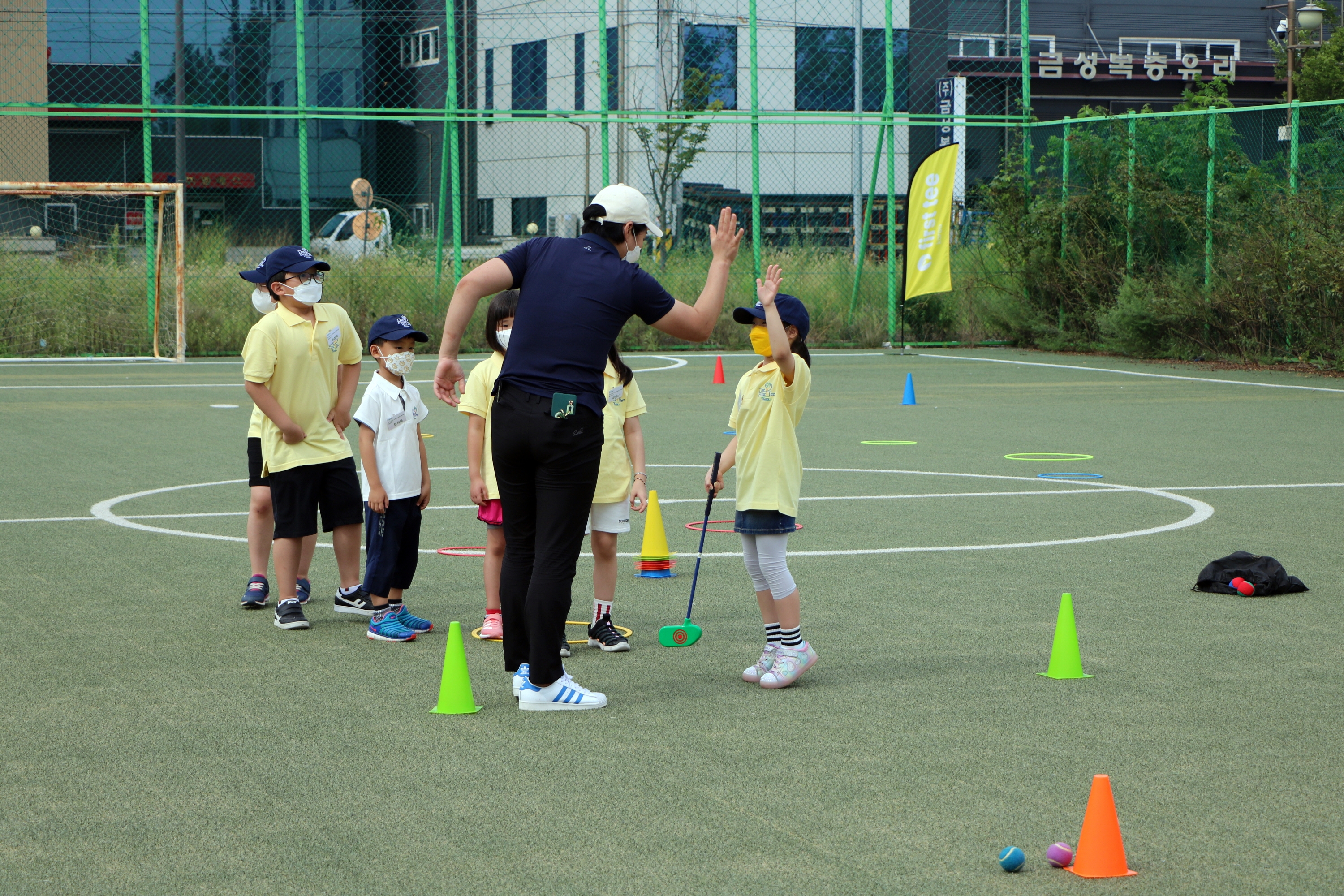 목표물을 맞힌 뒤 코치님과 하이파이브를 하며 즐거워하는 모습