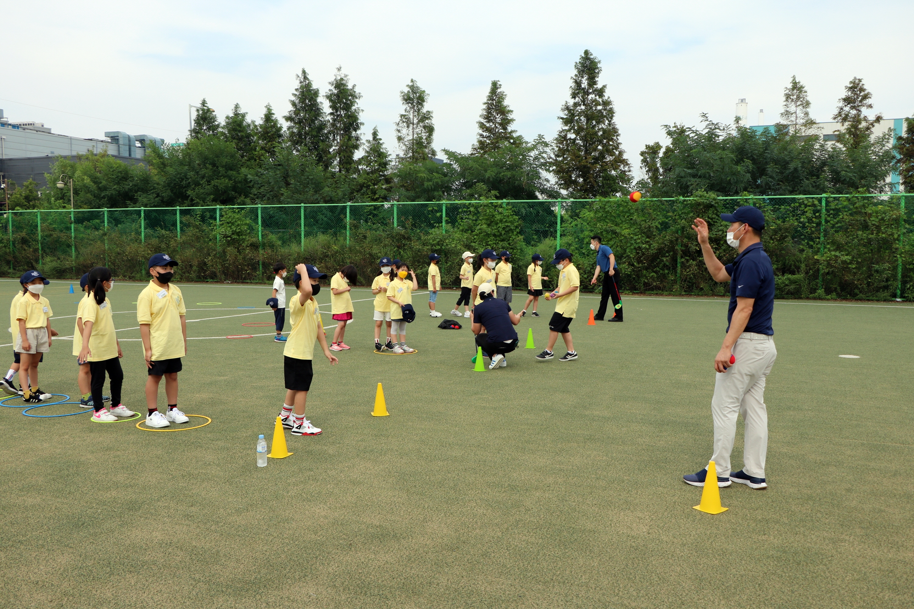 차례대로 코치님을 향해 공던지기를 하며 팔이동거리에 따라 달라지는 거리를 느끼고 있는 아이들