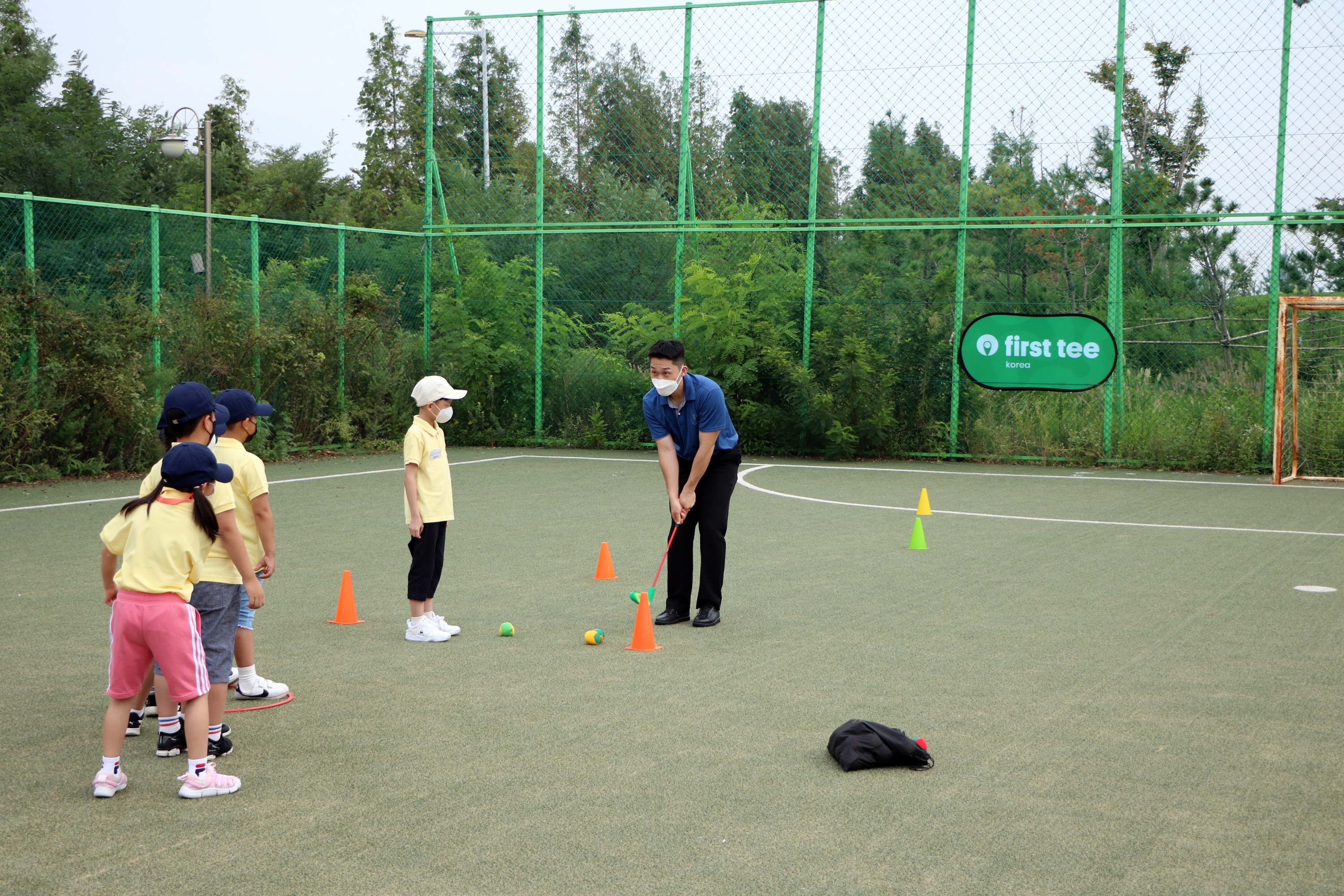 칩샷하는 요령을 설명하는 코치님을 보며 자기 자리에서 그대로 따라해 보는 교육생